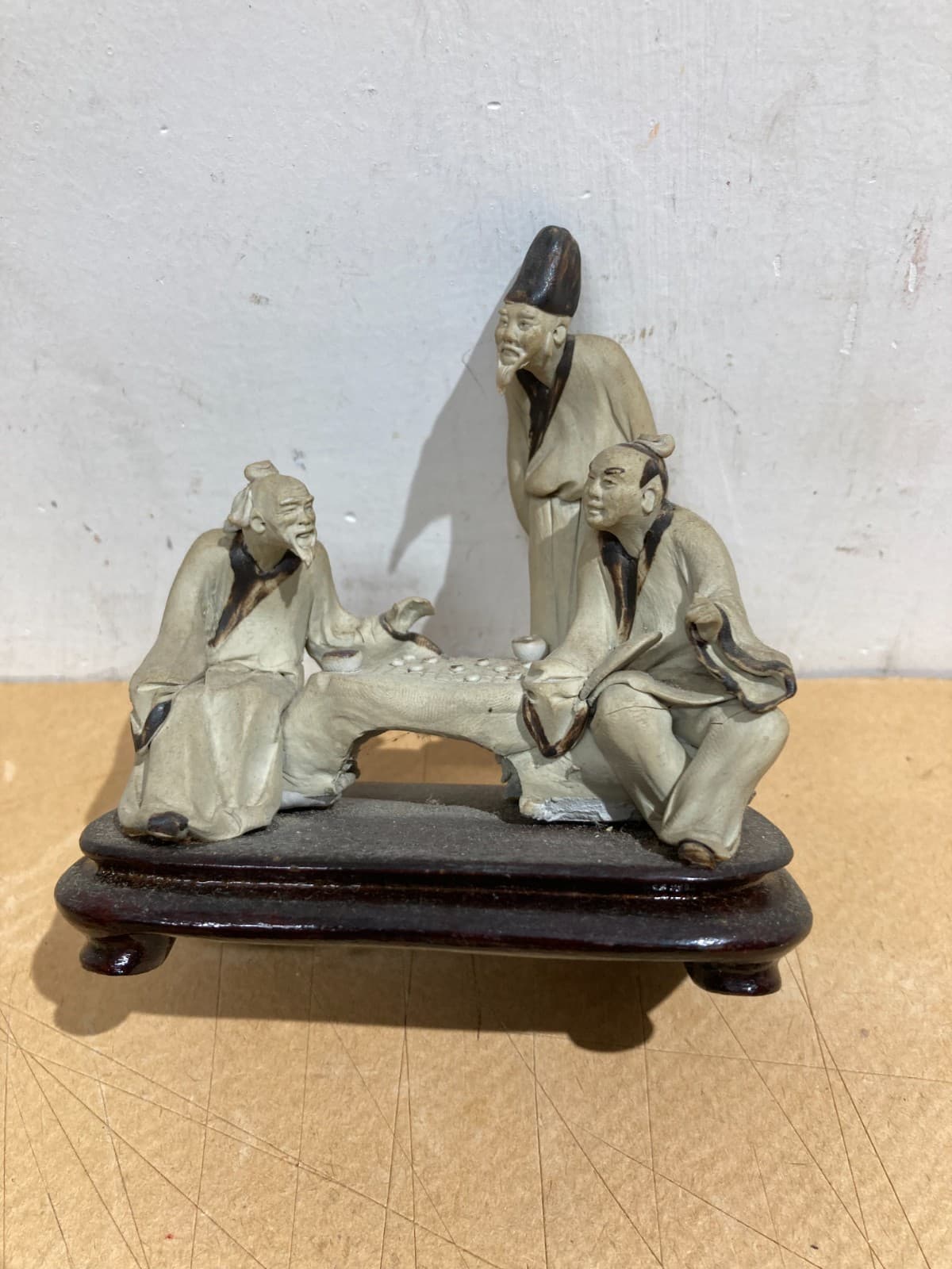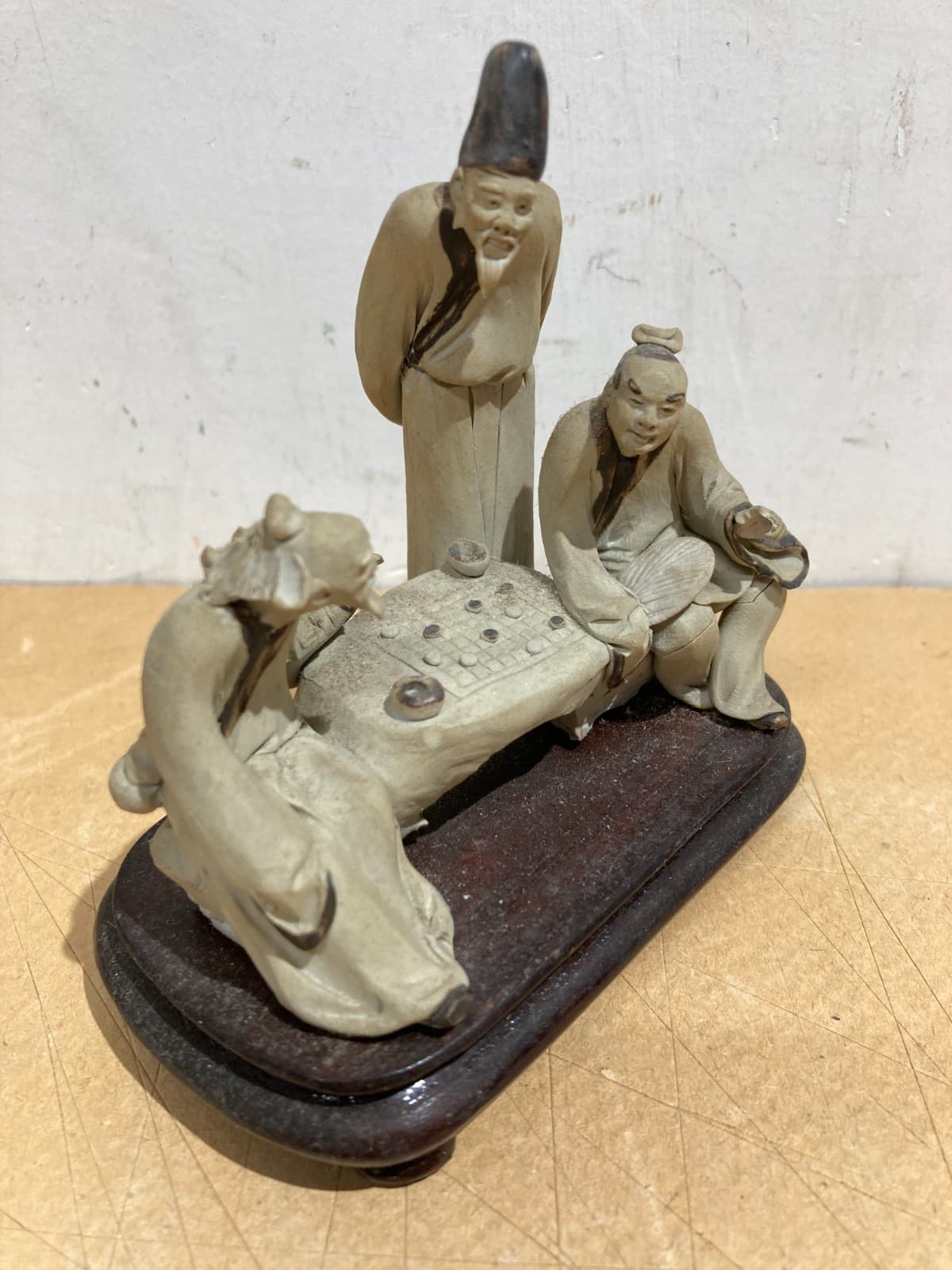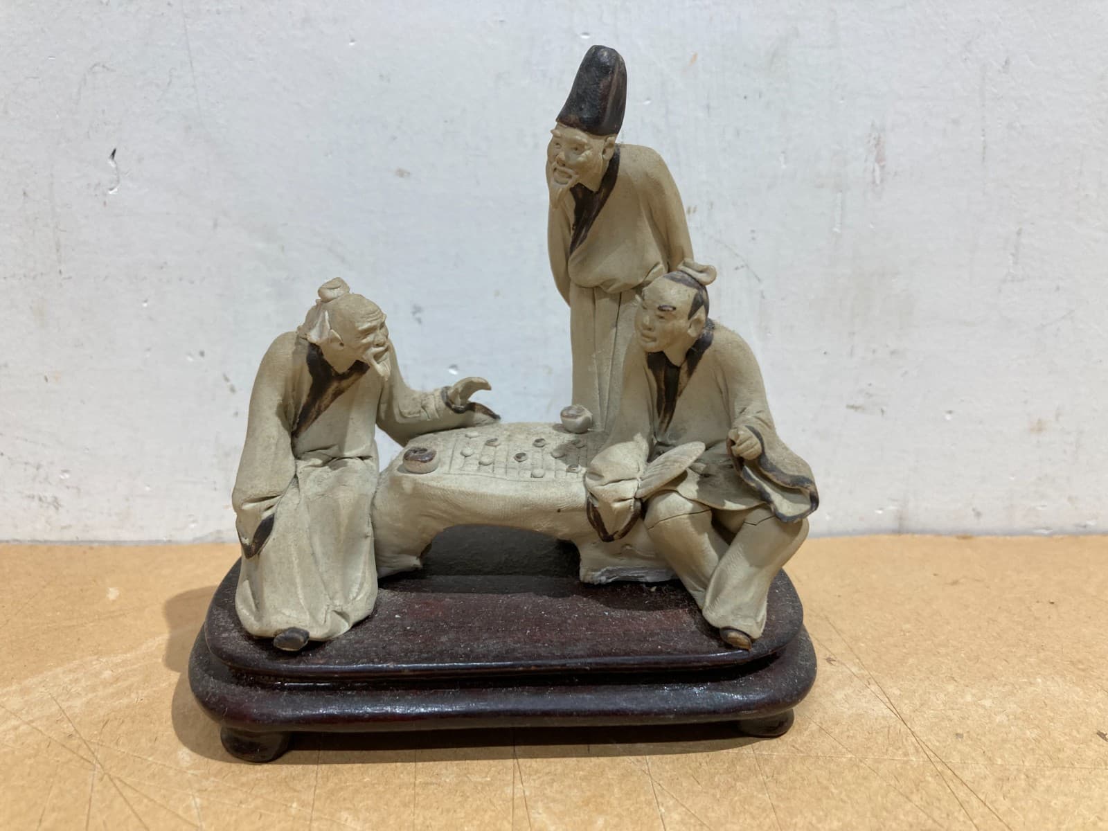 Piccola Scultura In Ceramica Con Figure Orientali Al Gioco Della Dama
