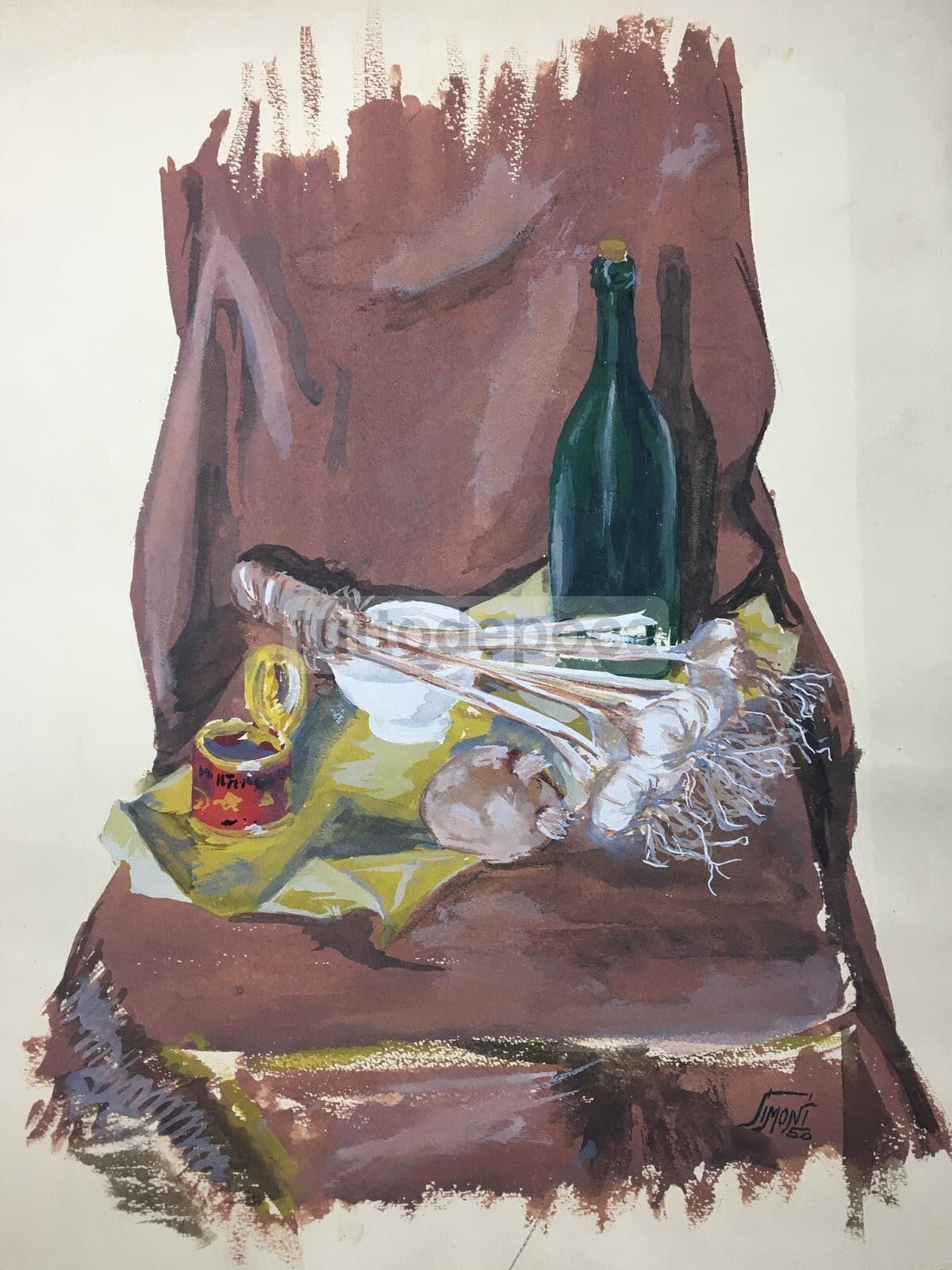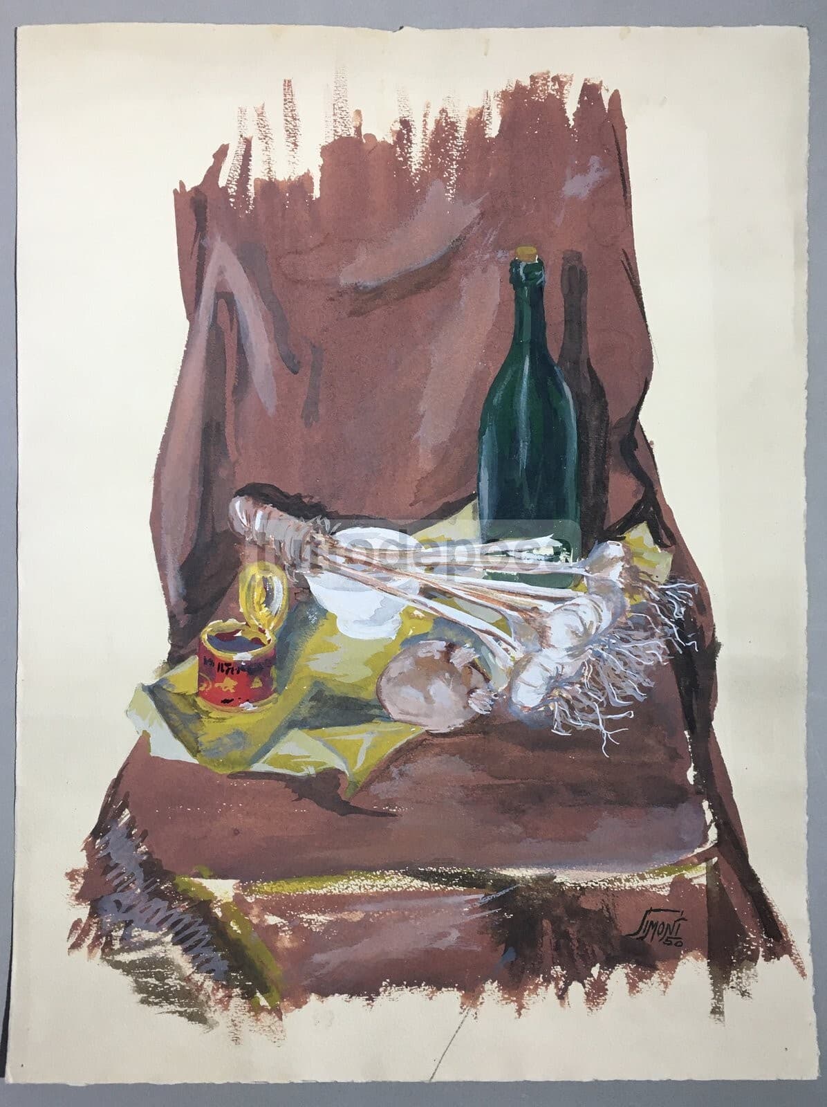 Arte Contemporanea Natura Morta Con Aglio Dipinto d'Epoca Tempera 1950 Simoni