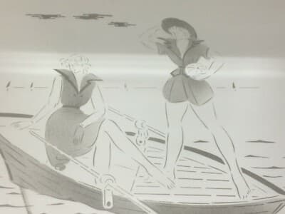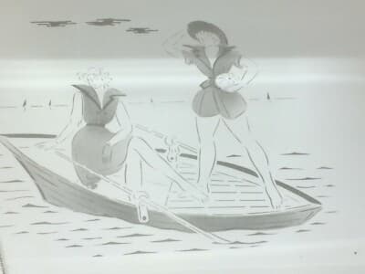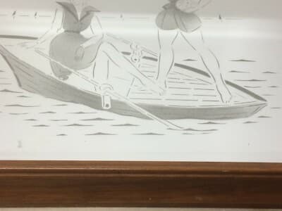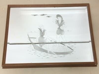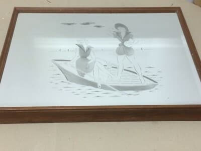 Vetri Decorativi E Modernariato: Specchio Inciso Con Coppia Di Giovani Donne In Barca
