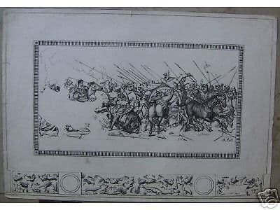 Litografia Originale: Scena Di Battaglia Con Animali Dell'Antica Roma, XIX Secolo