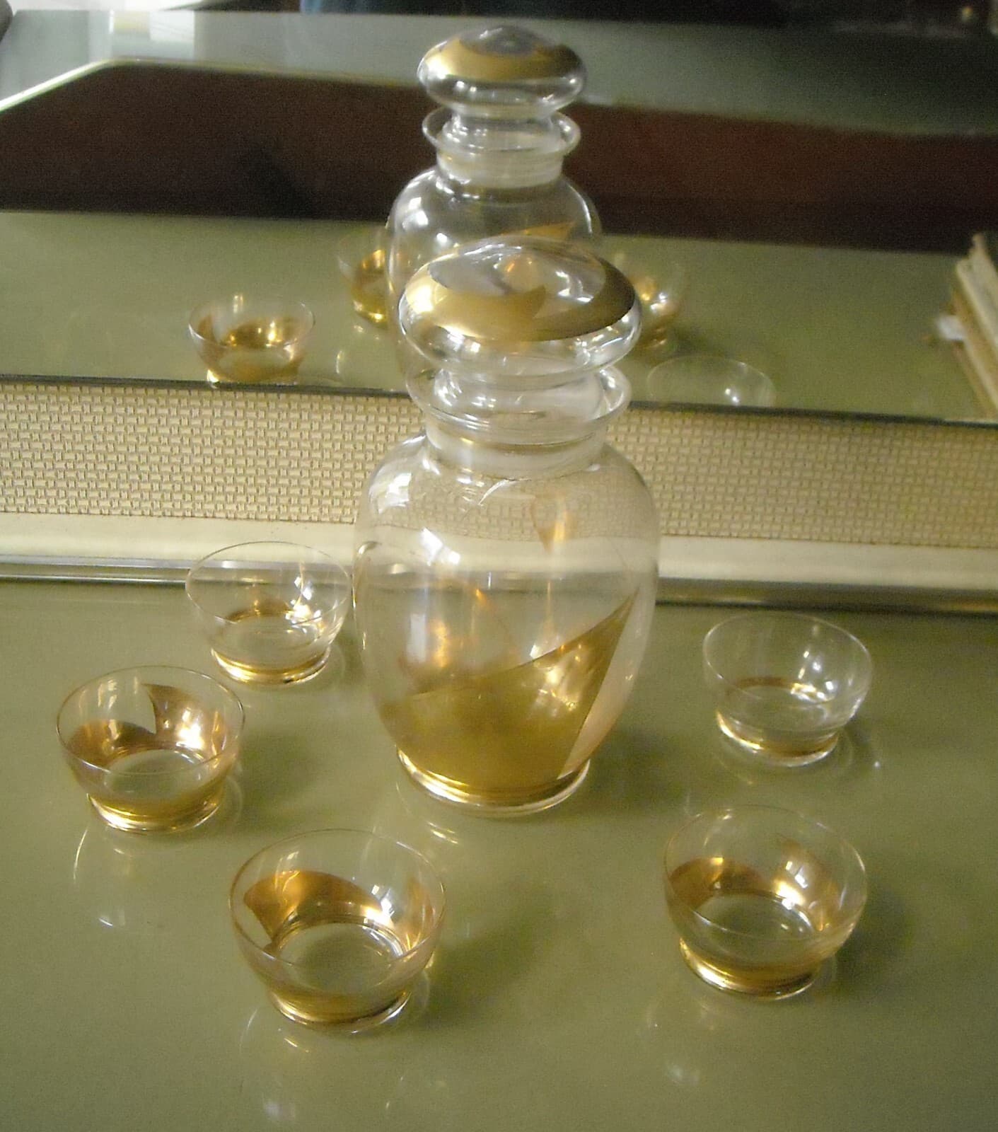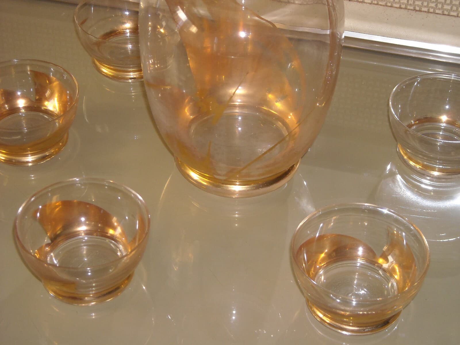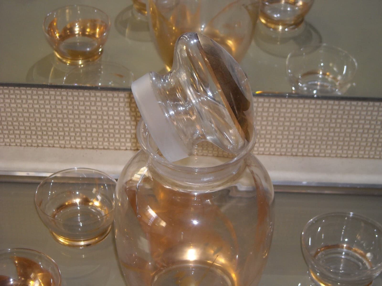 Elegante Servizio In Vetro Con Laminatura Dorata. Vasetto Con Tazzine Da Vetrina, Anni '50.