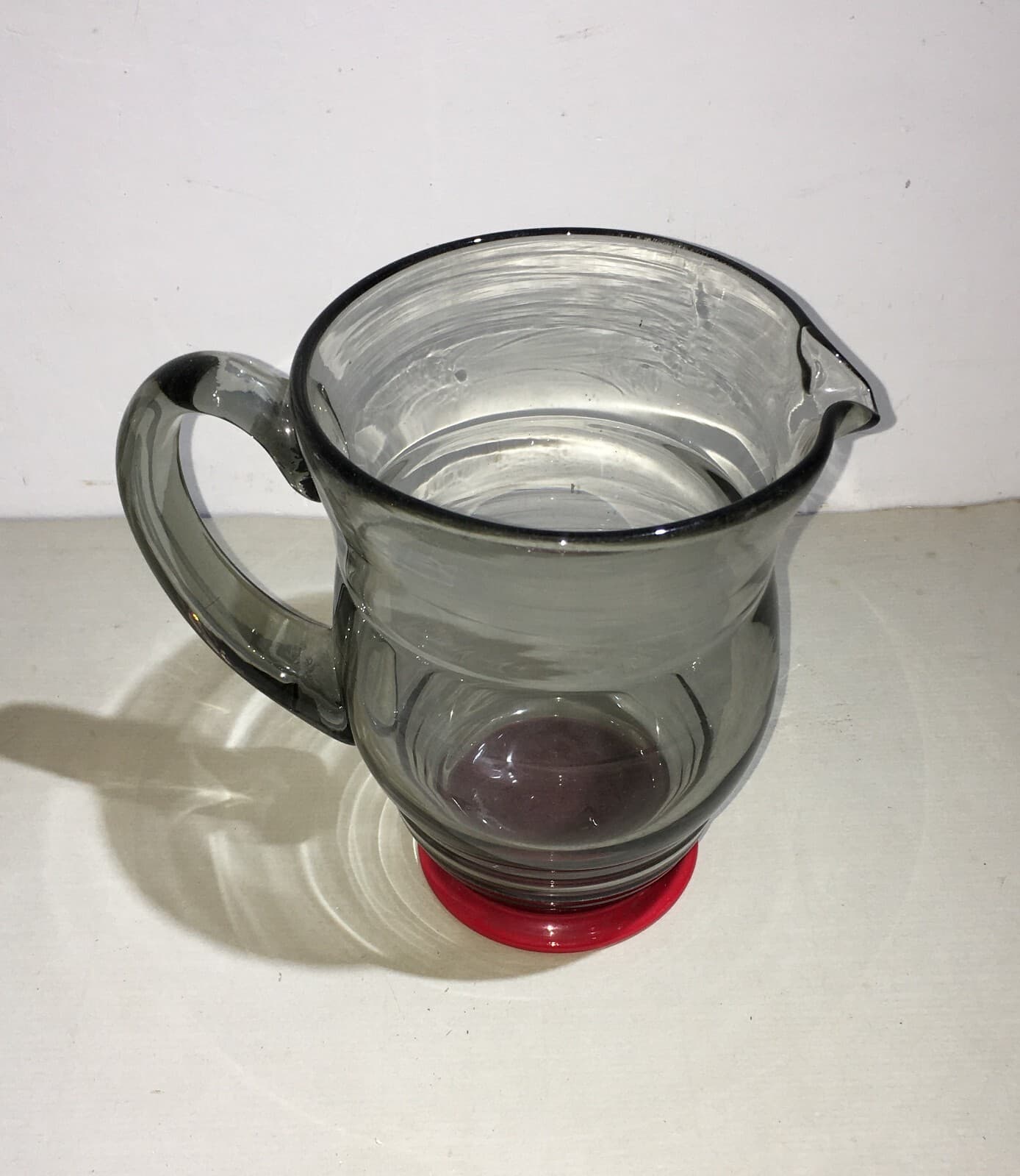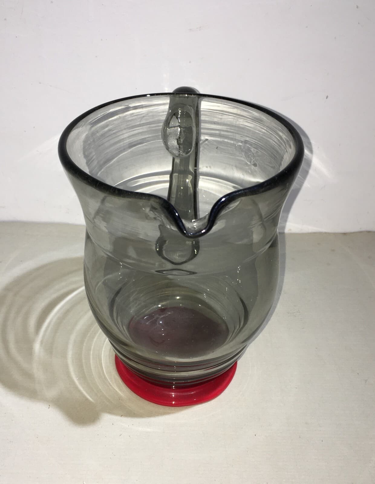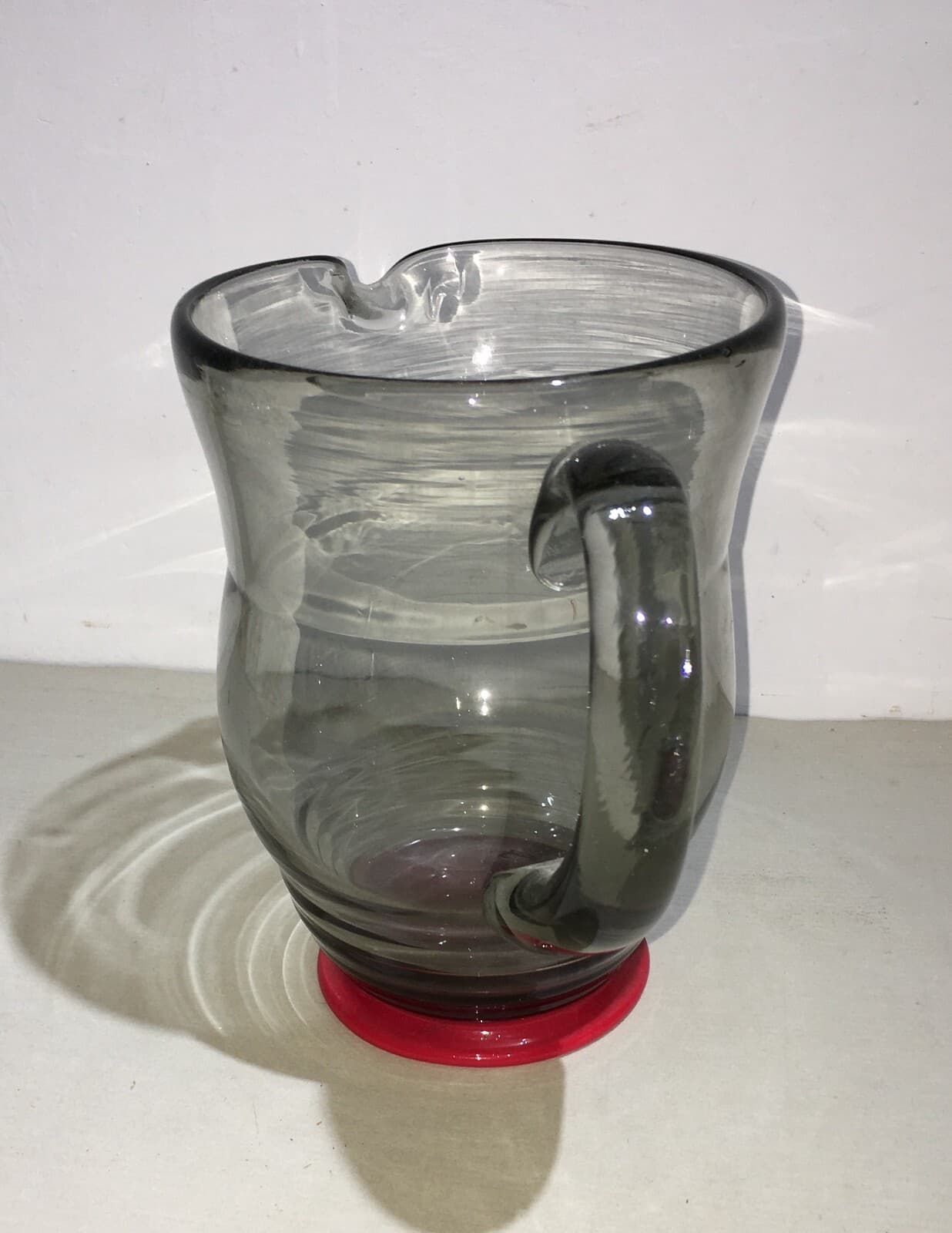 Modernariato: Caraffa Decorativa In Vetro Fumè E Base Rossa