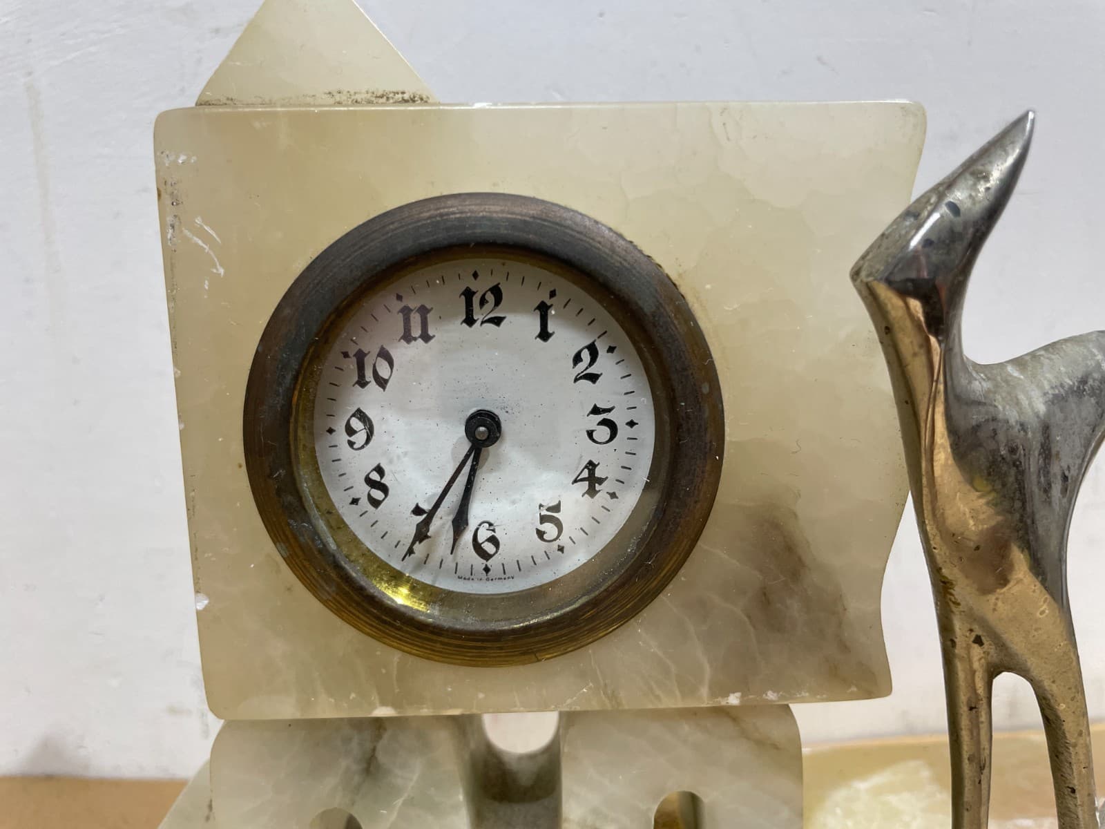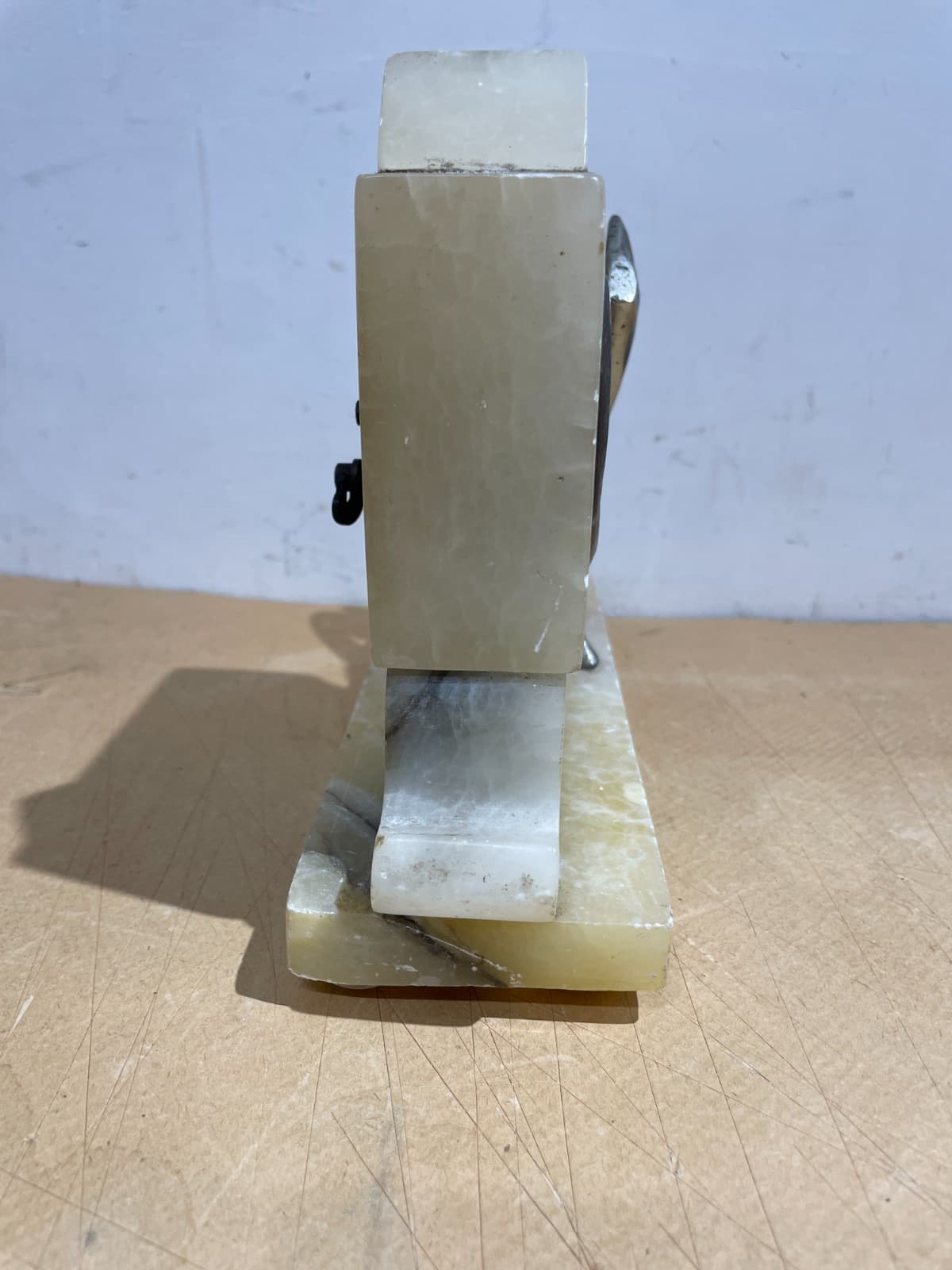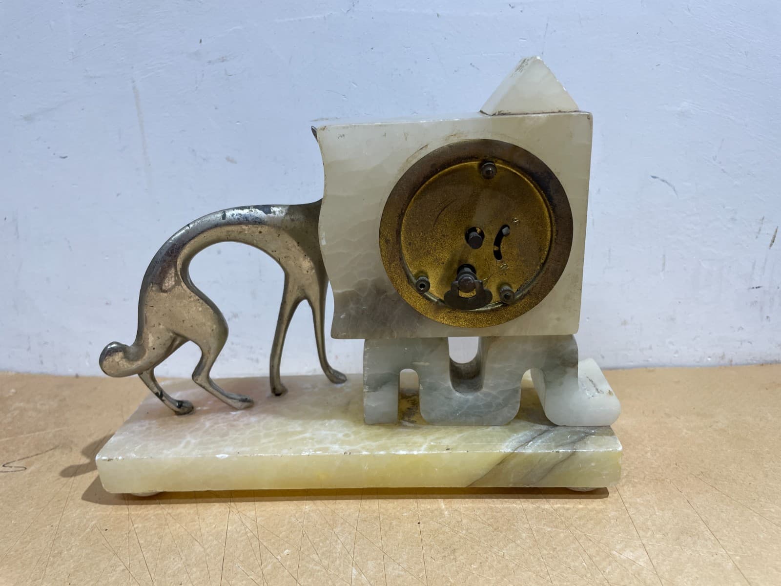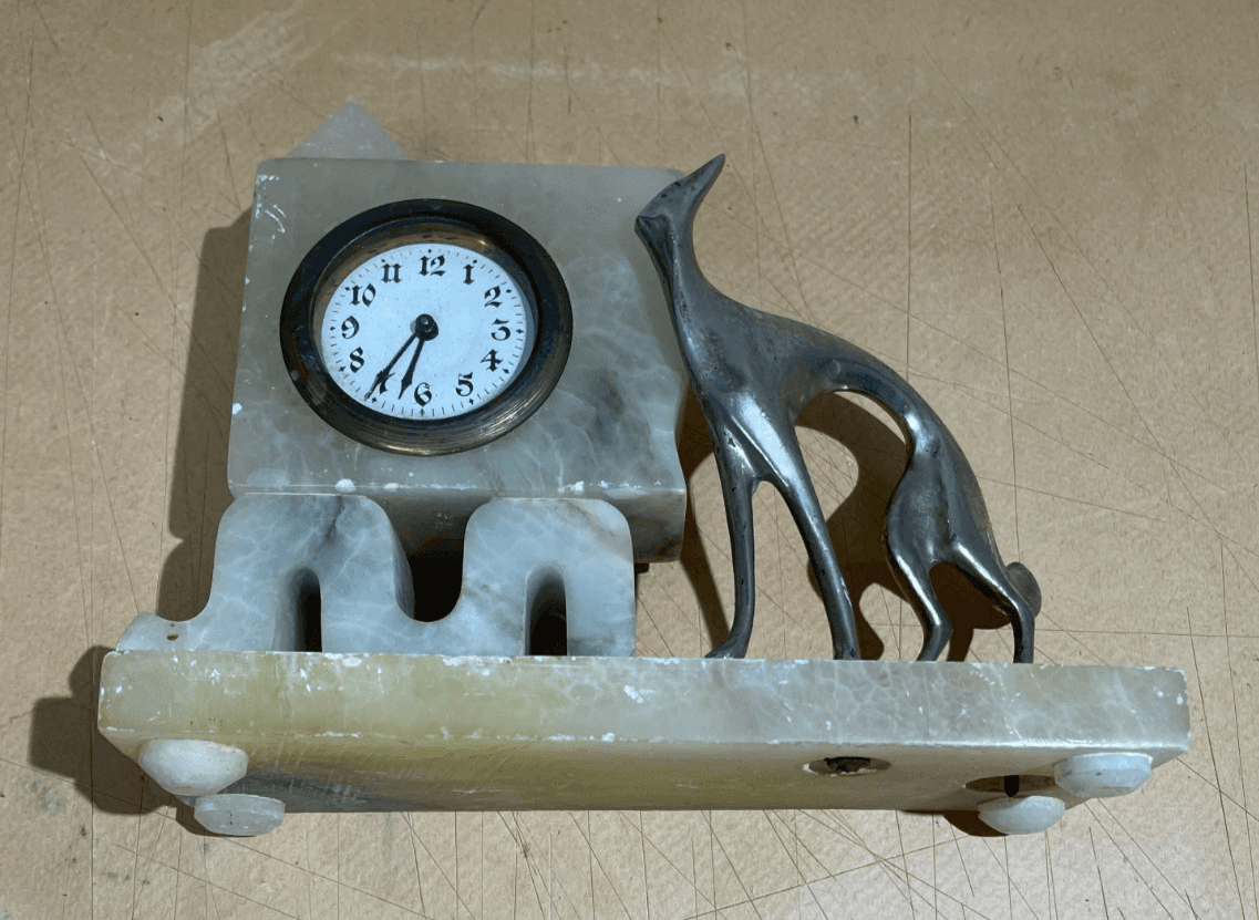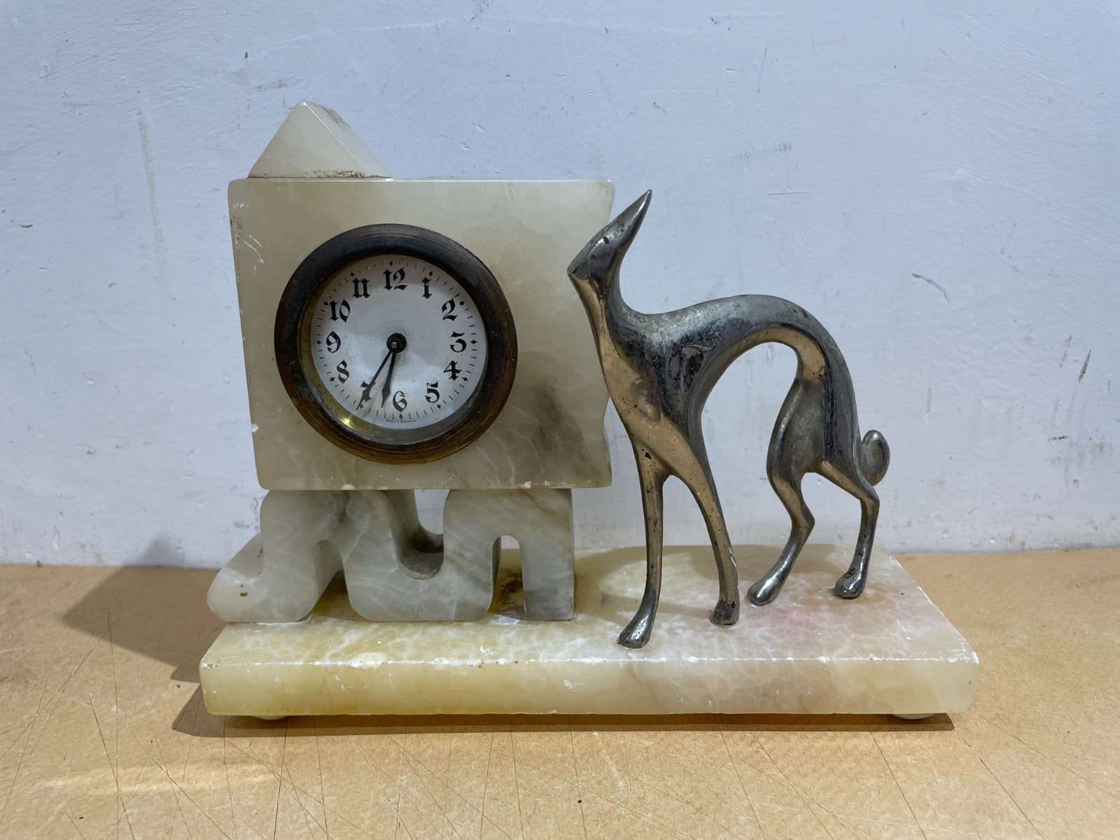Orologio Da Tavolo Art Déco Con Figura Di Levriero In Alabastro