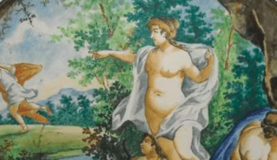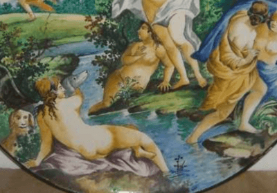 Arte E Mitologia: Piatto In Ceramica Con Scena Mitologica E Nudi Femminili
