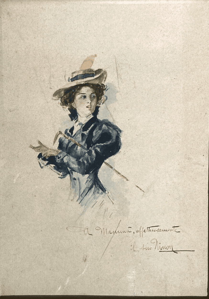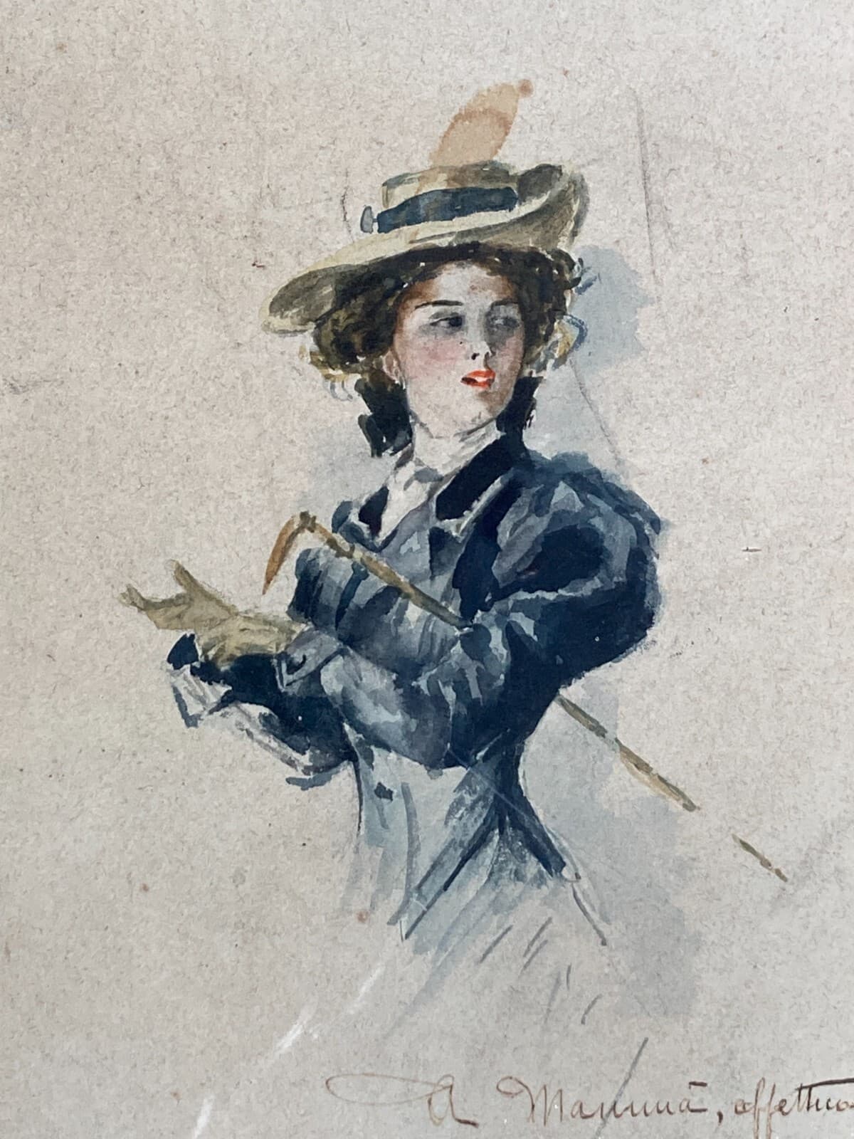 Ninon Vaccarella: Dipinto Ad Acquerello Di Signora In Stile Liberty Con Dedica