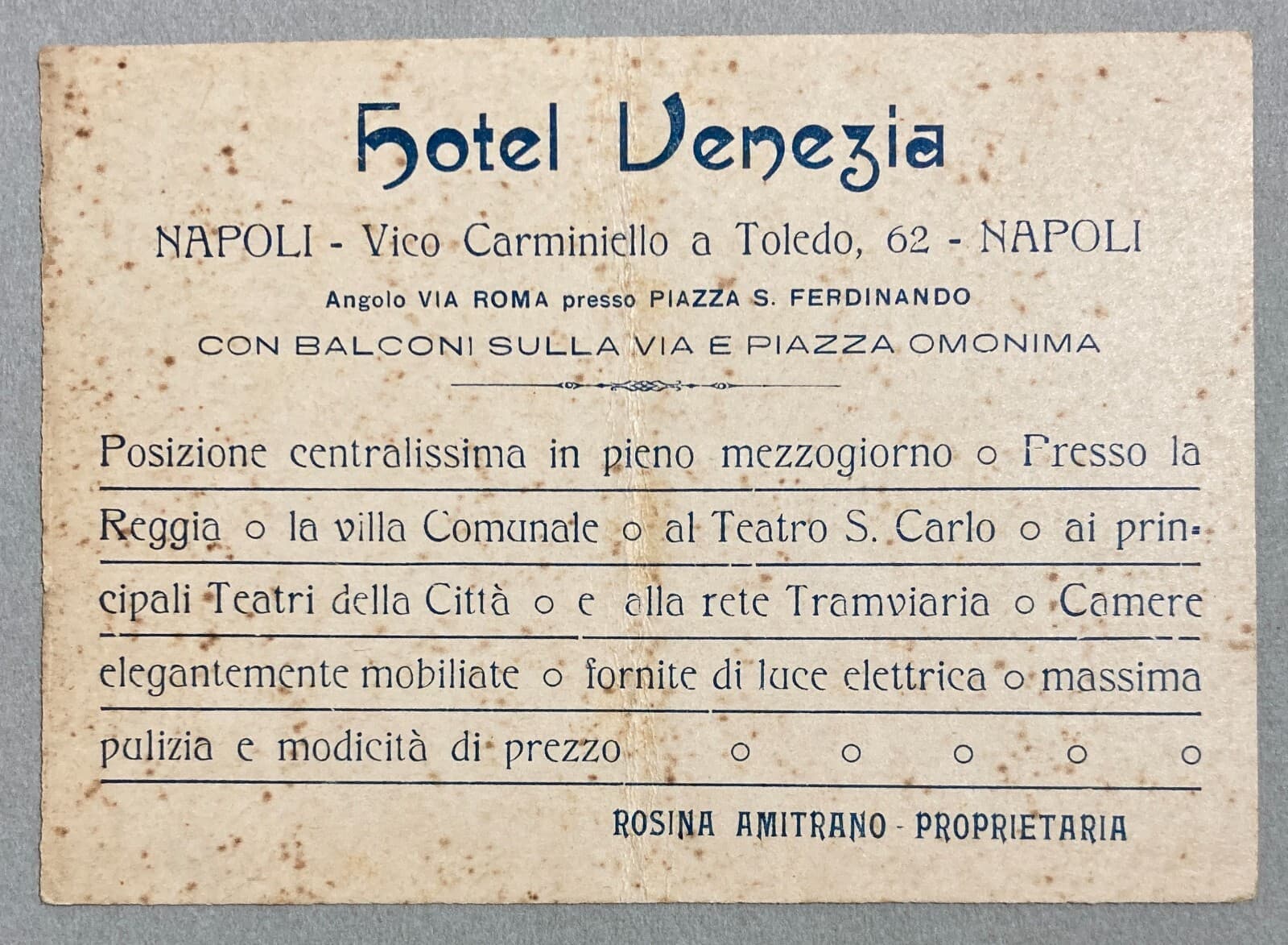 Napoli Antica Pubblicità Hotel Venezia Rosina Amitrano Cartoncino d'Epoca