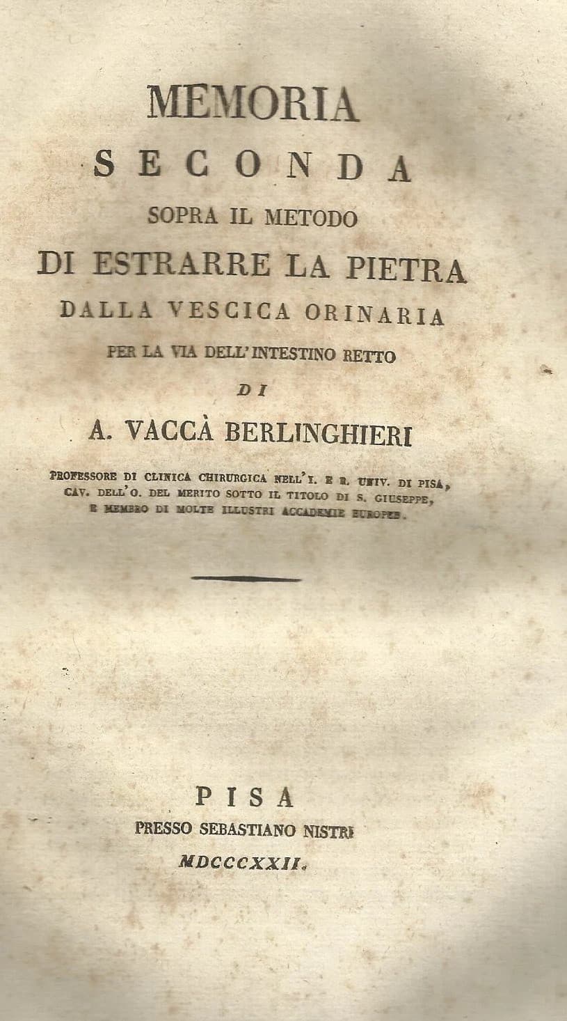 Medicina, Chirurgia, Urologia: Memoria Seconda Sopra Il Metodo Di Estrarre La Pietra Dalla Vescica Orinaria Per La Via Dell'Intestino Retto Vaccà Berlinghieri (1822)