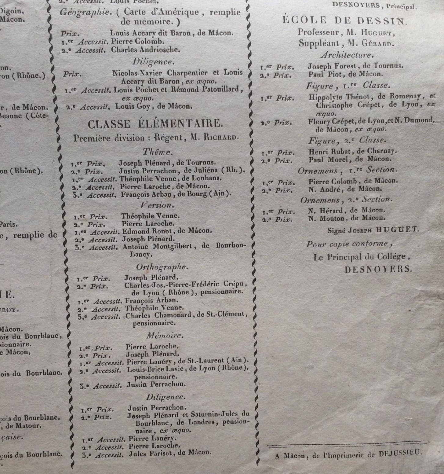 Didattica Scuola Allievi Premiati: Francia, Digione, 1824. Raro Antico Manifesto