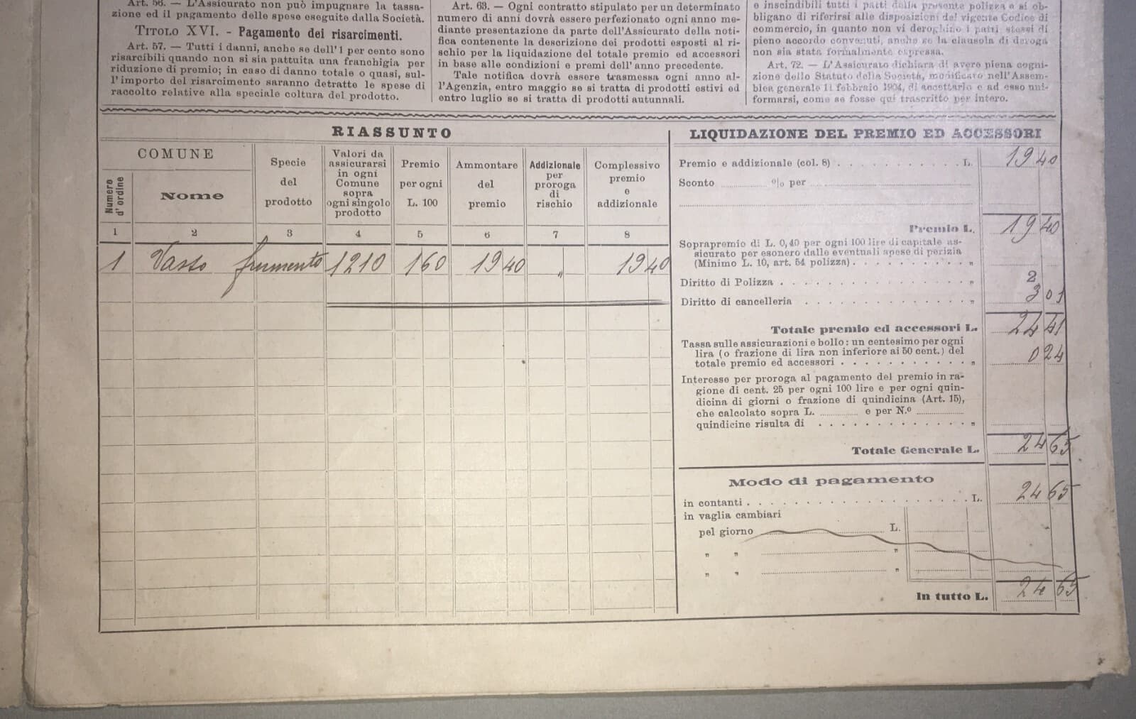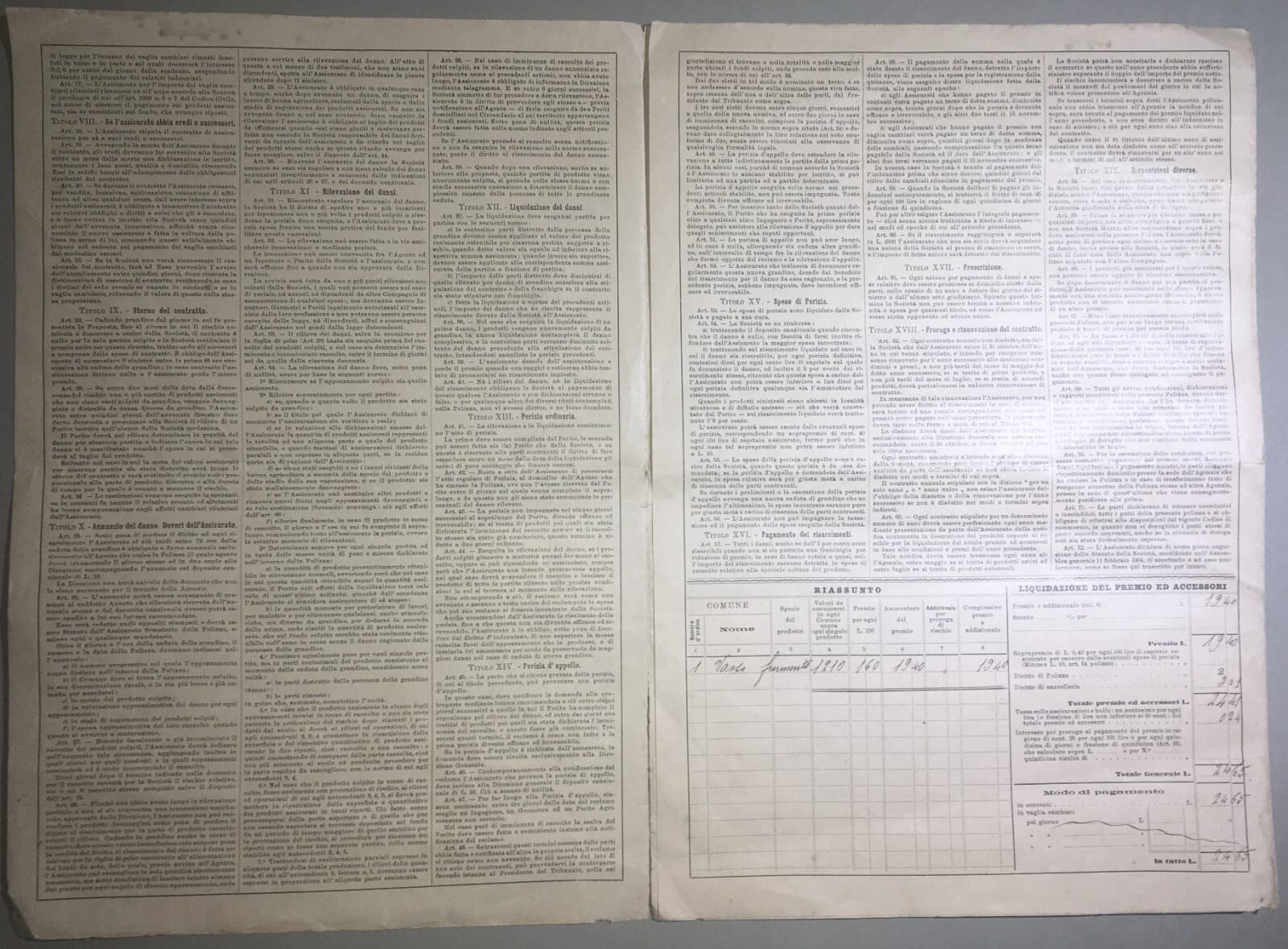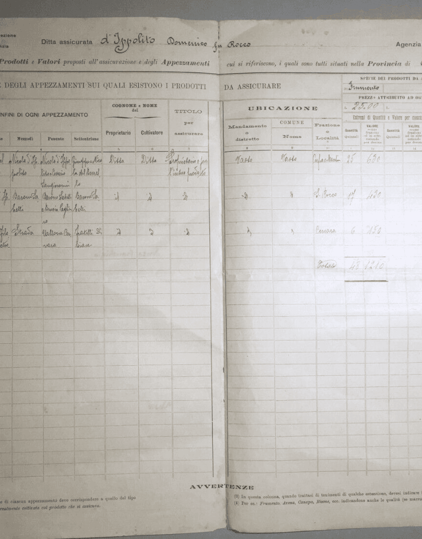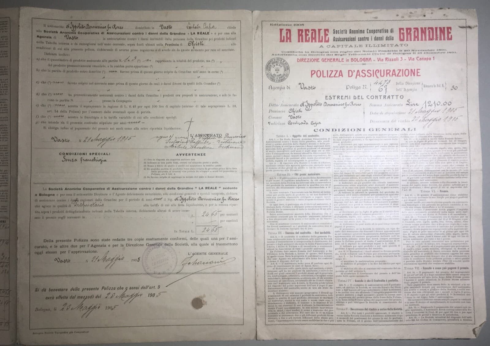 Polizza Di Assicurazione Agraria Reale Grandine, Vasto (Abruzzo), 1905