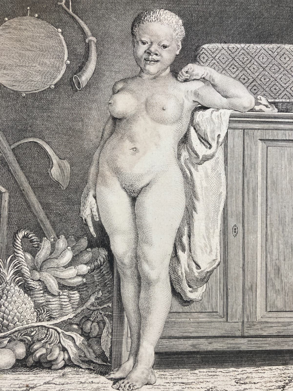Antica Incisione Figura Femminile Nuda Con Ortaggi Artista De Sève Guttemberg