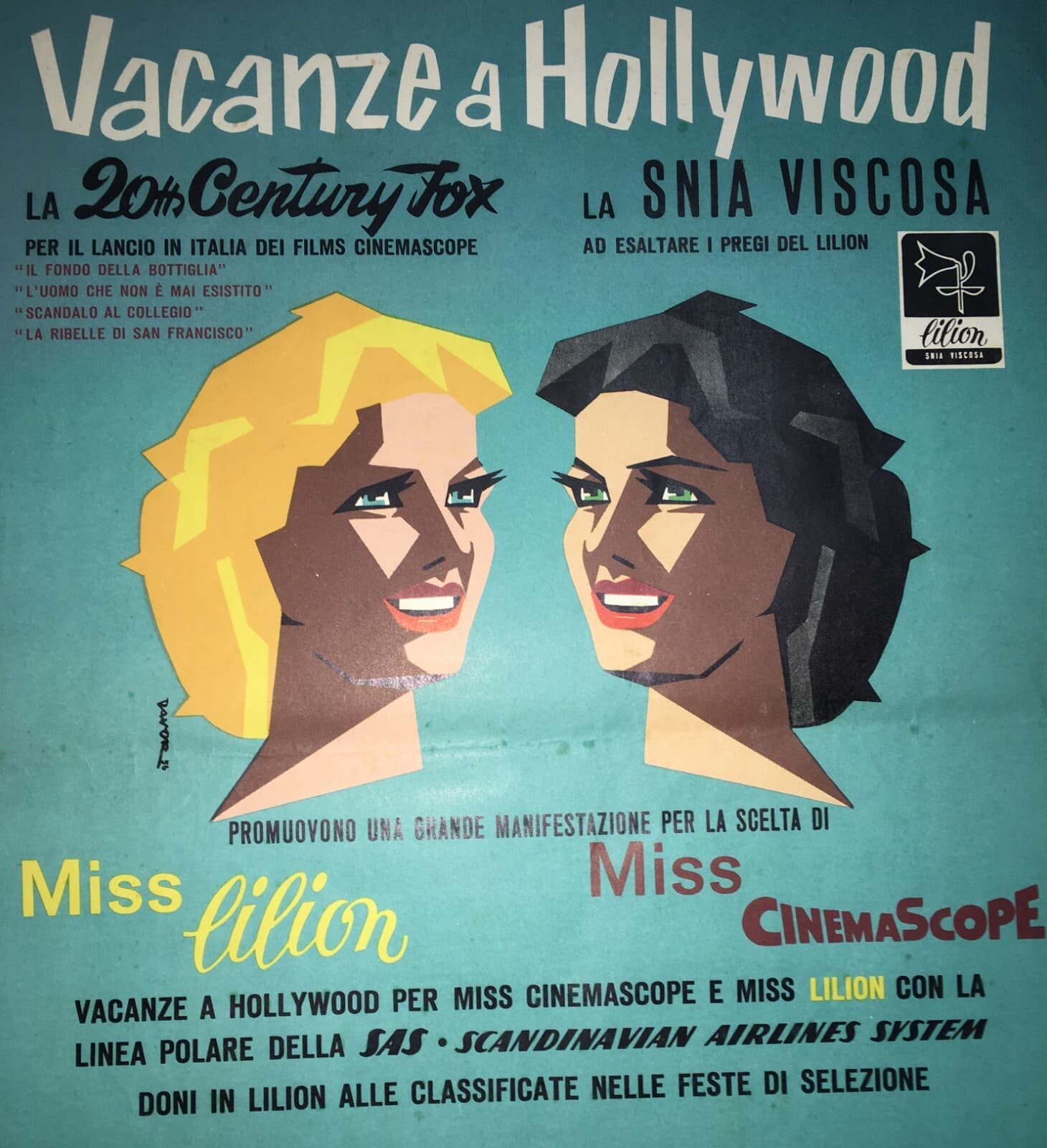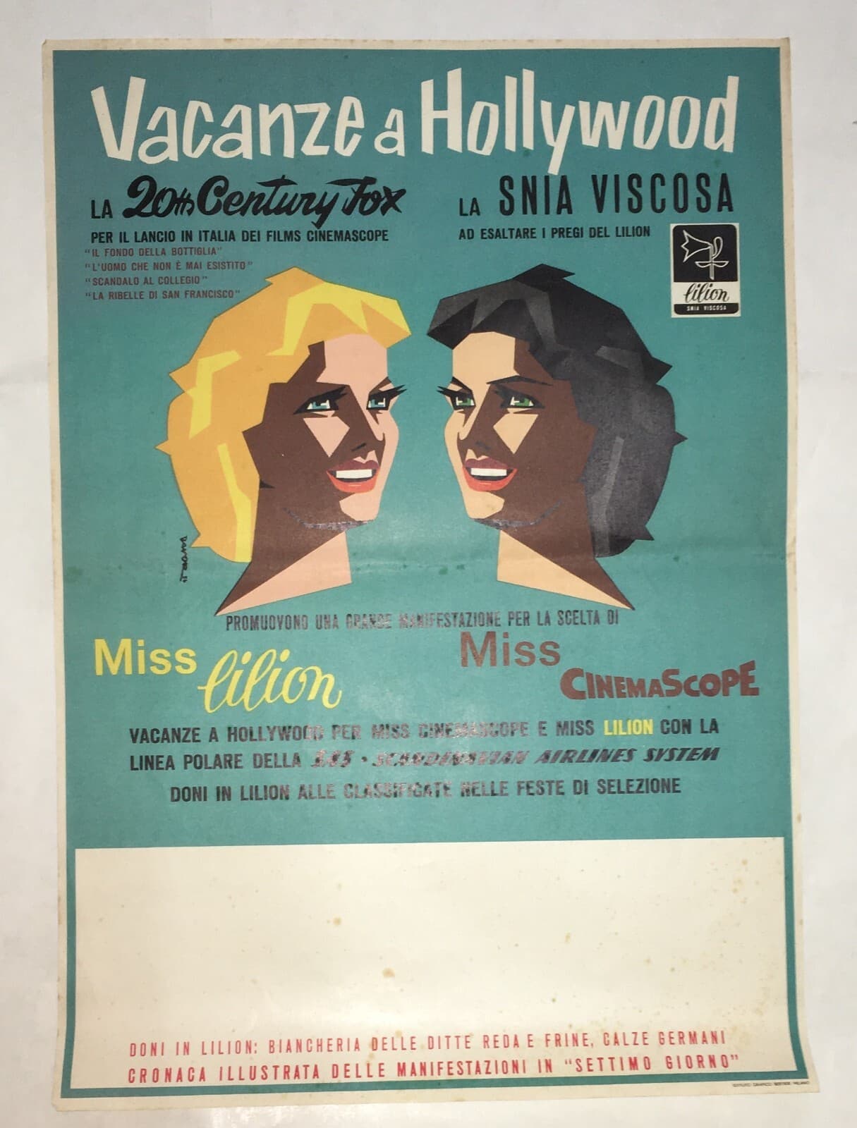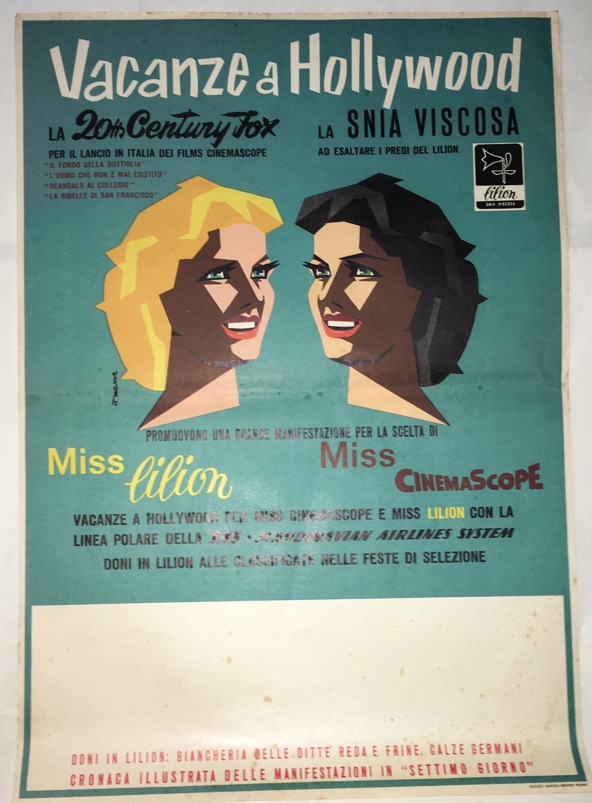 Cinema, Vacanze A Hollywood: Cinemascope, Snia Viscosa, Lilion. Locandina Pubblicitaria.