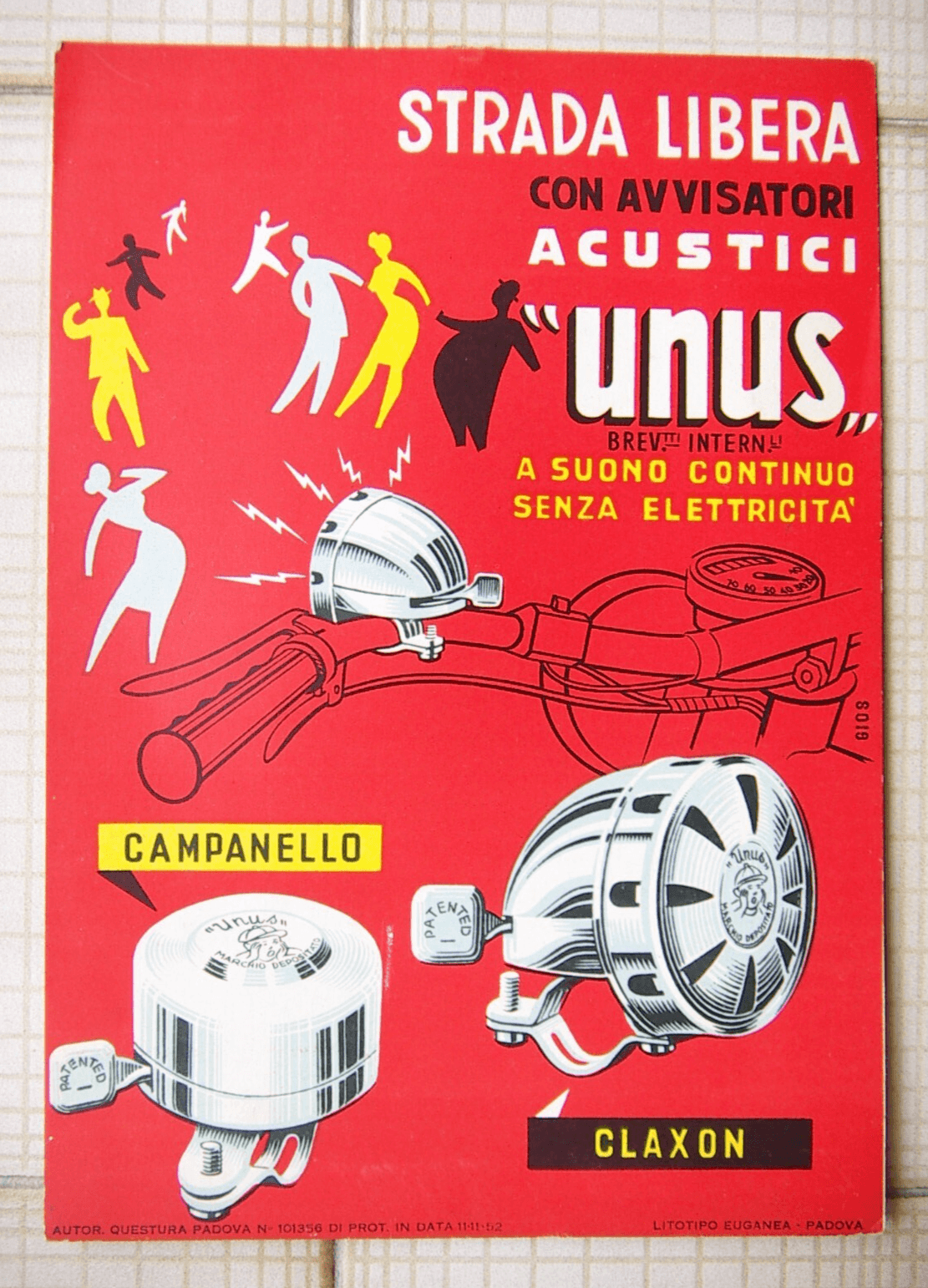 Cicli, Biciclette, Campanello, Claxon, Avvisatori Unus, Rara Locandina Pubblicitaria
