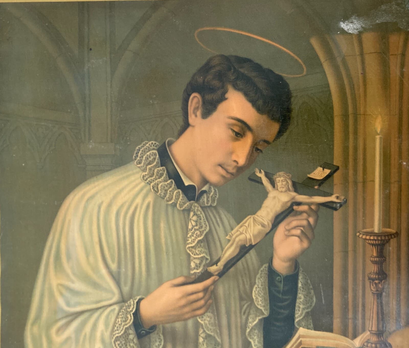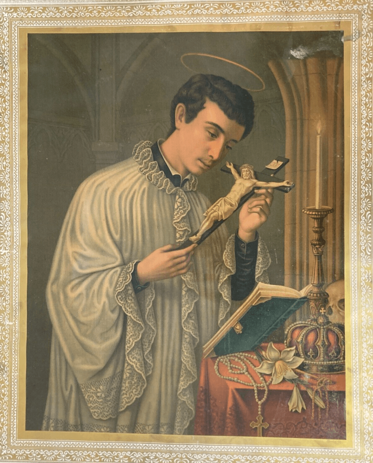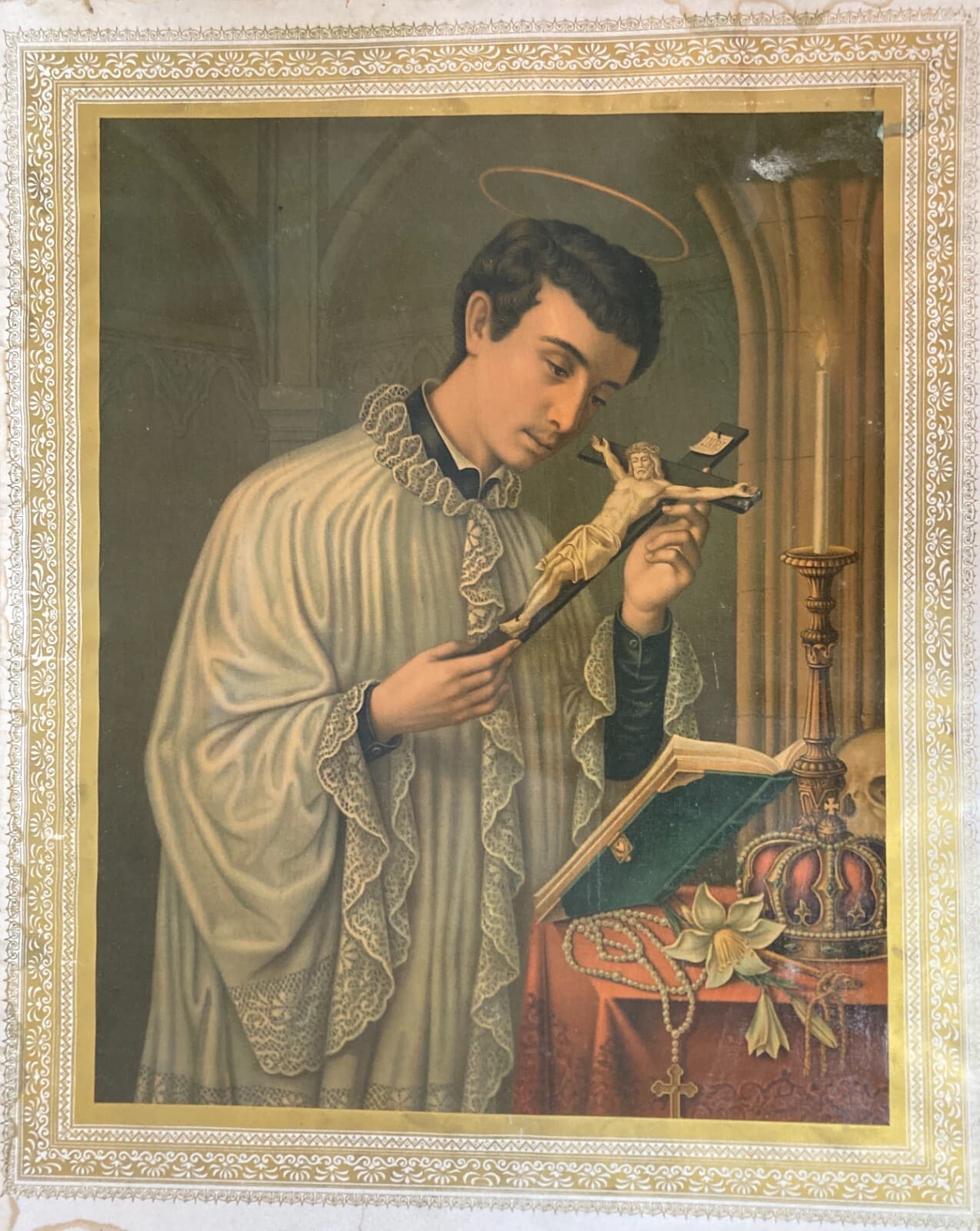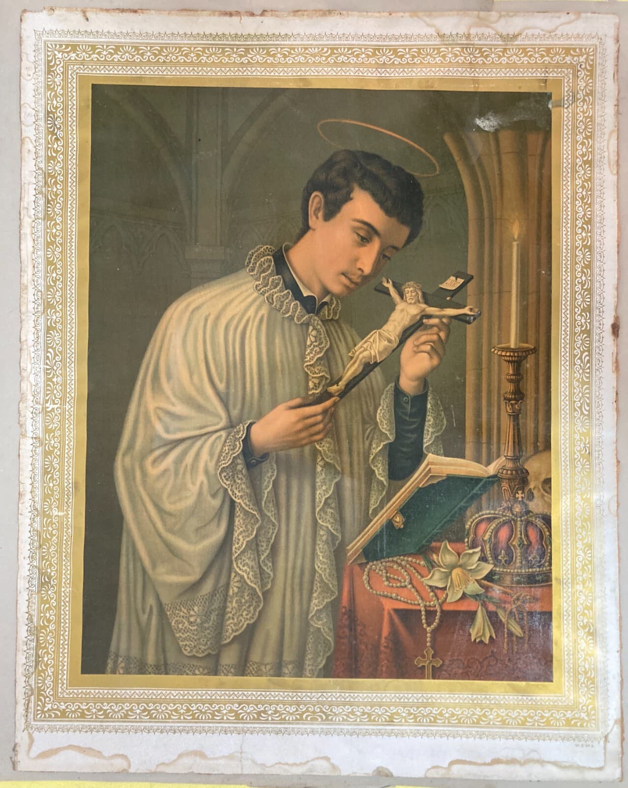 Antica Stampa Devozionale San Luigi Gonzaga Simboli Iconografici
