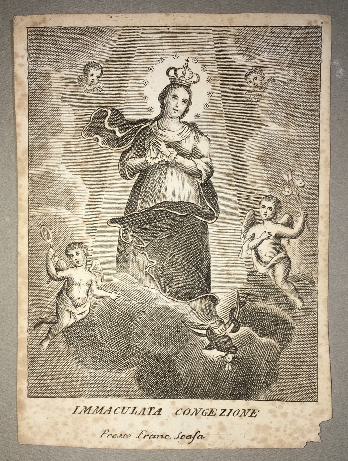 Antica Stampa Popolare Devozionale: Madonna Immacolata. Incisione Di Francesco Scafa
