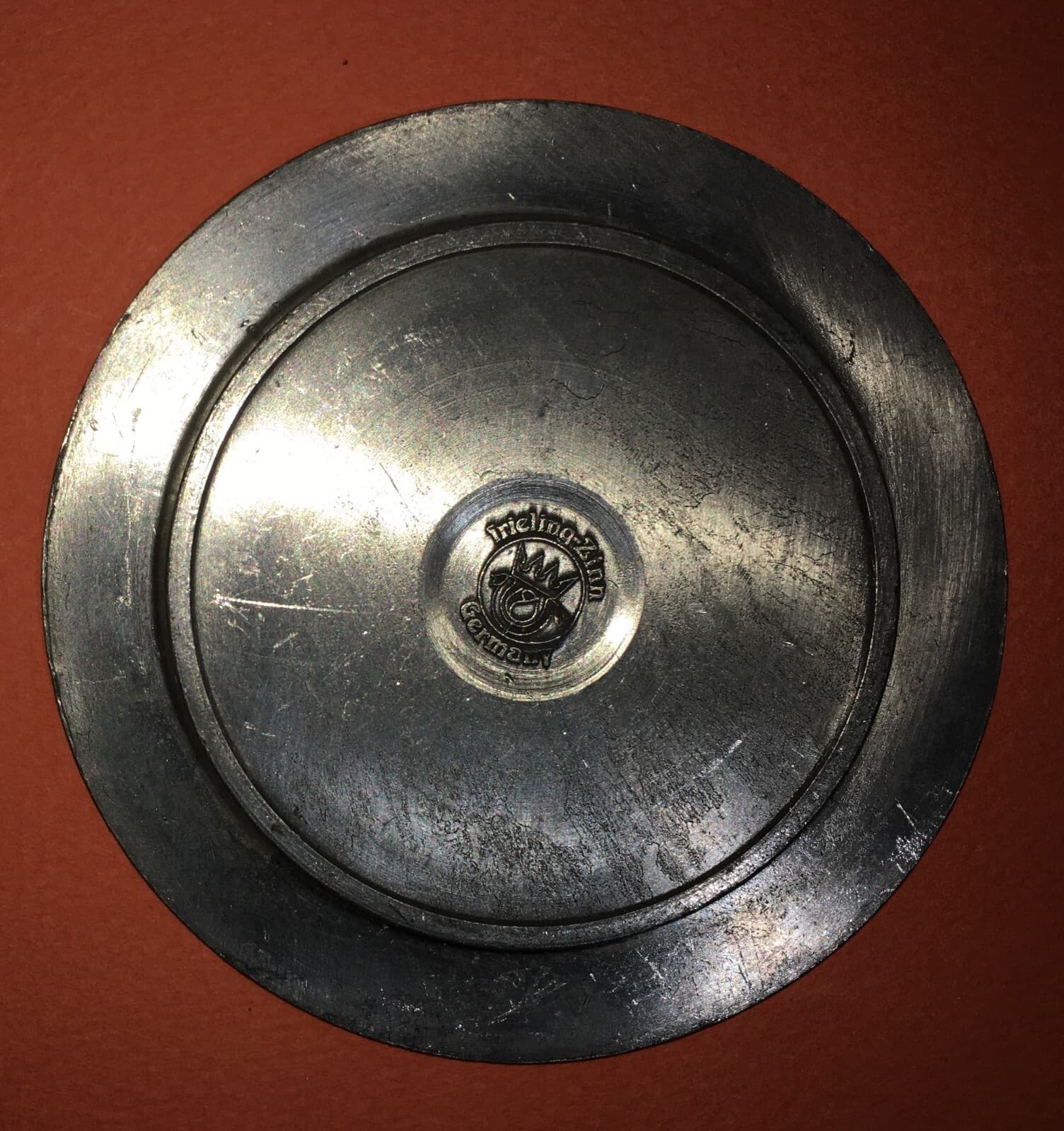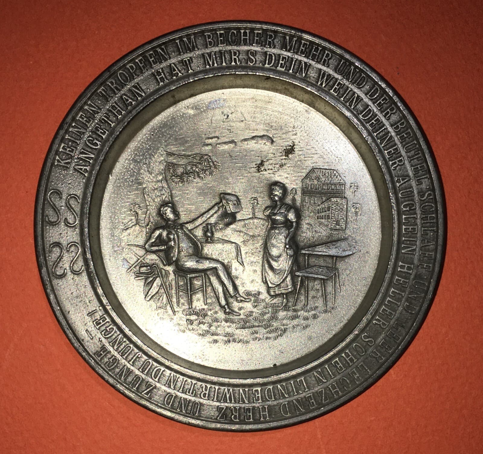 Piattino Artistico In Peltro Con Veduta Popolare E Scritte Tedesche Frieling Zinn