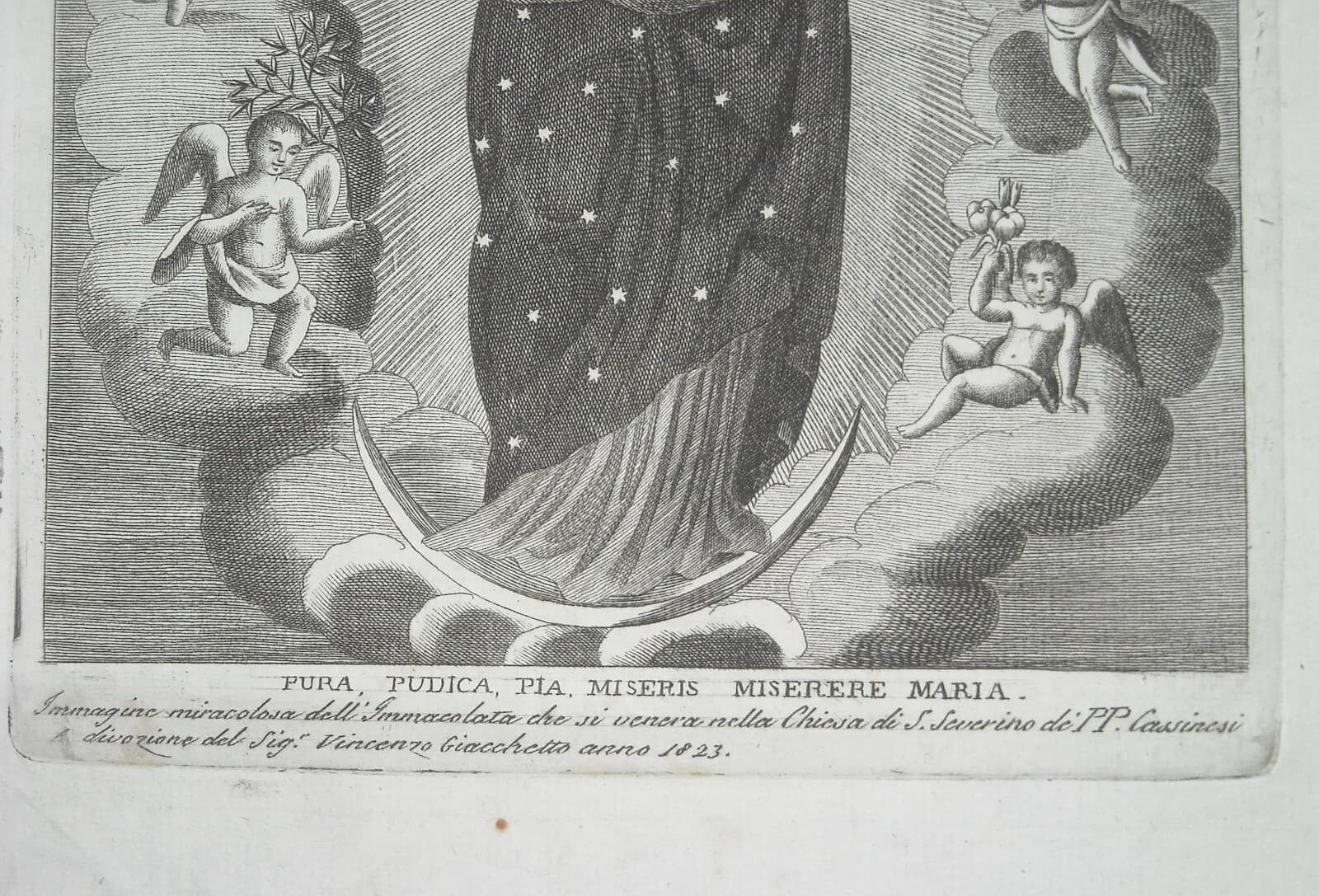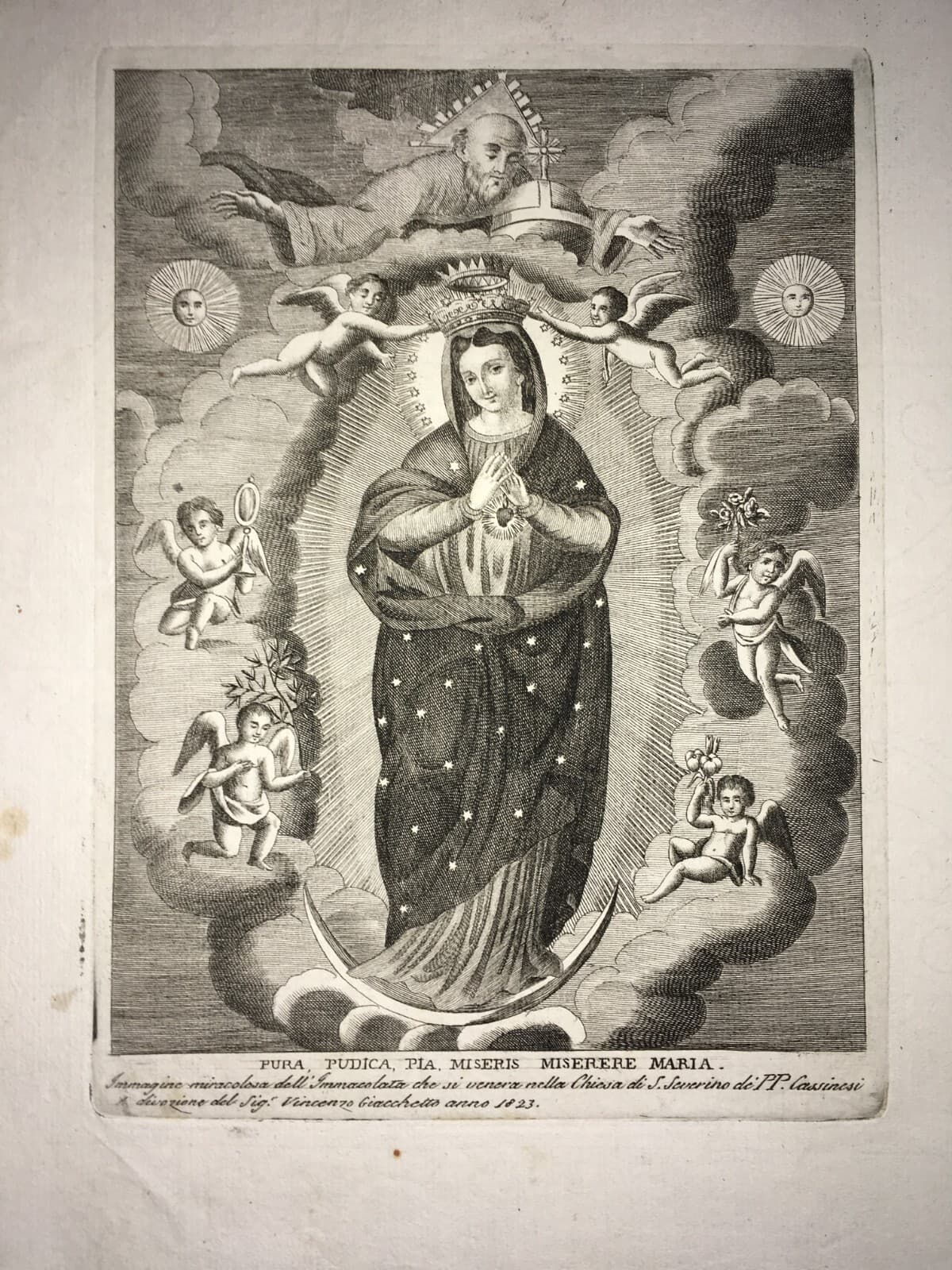 Antica Stampa Popolare Devozionale: Madonna Immacolata, Giacchetto, Padri Cassinesi