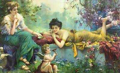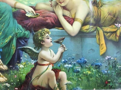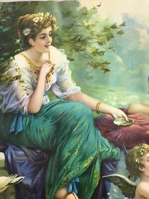 Cromolitografia Liberty Con Giovani Donne E Amorino