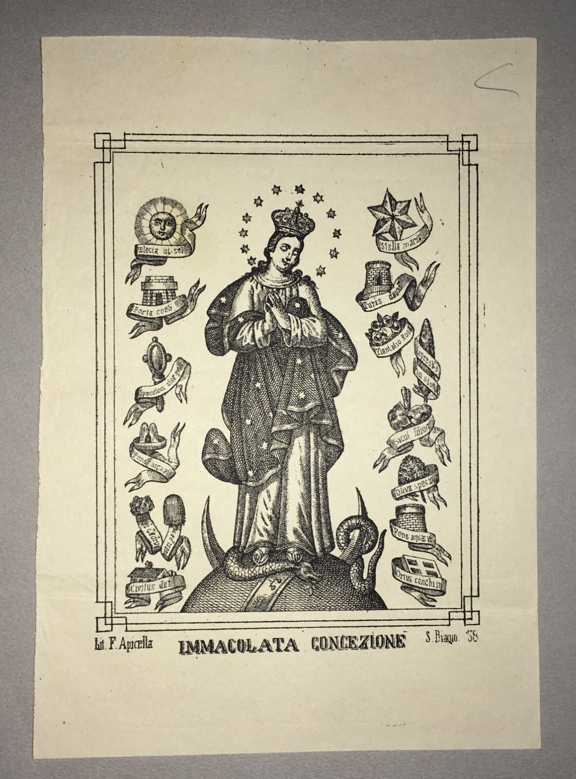 Antica Stampa Popolare Devozionale, Madonna Immacolata, Napoli, Litografo Apicella