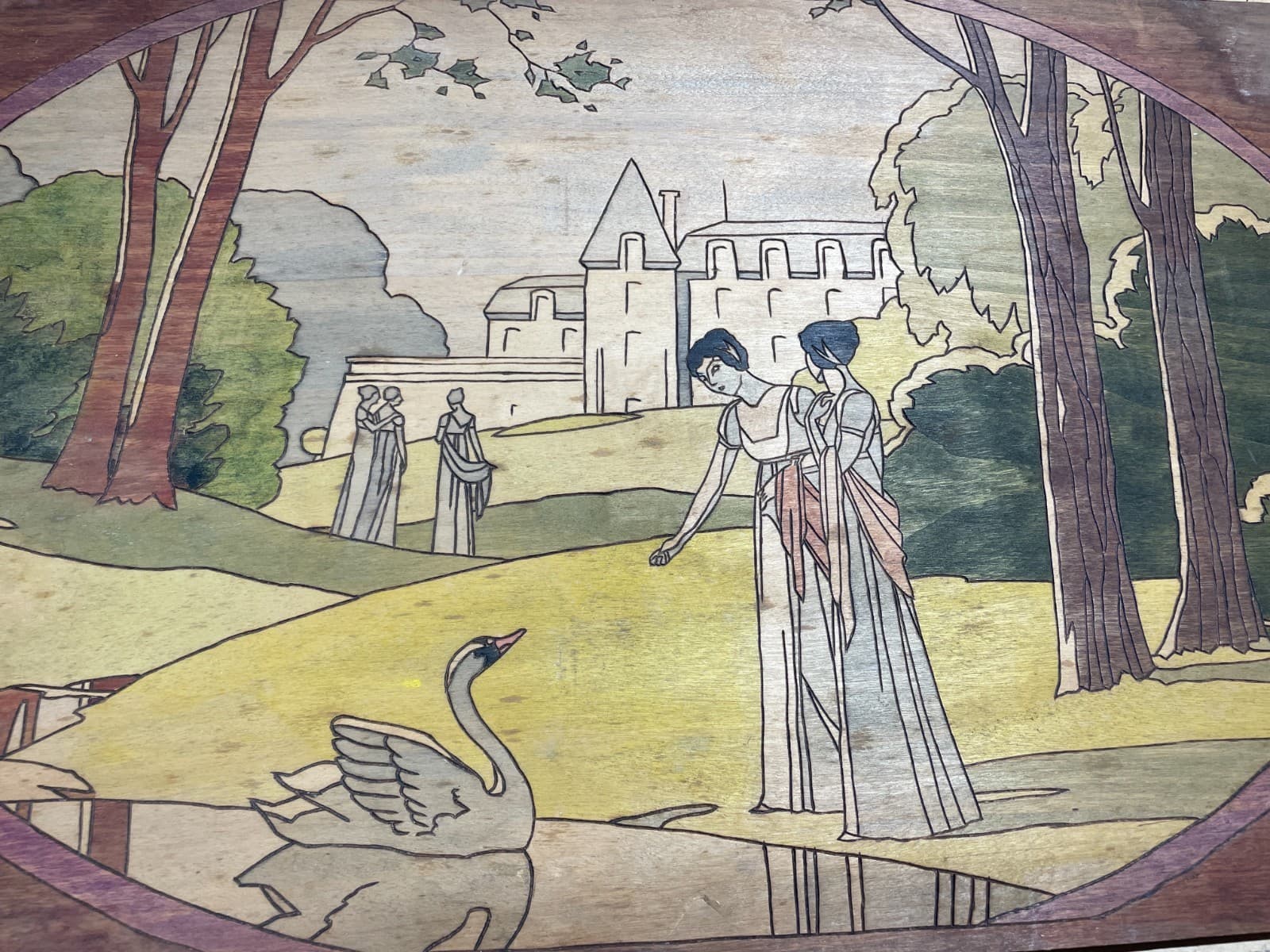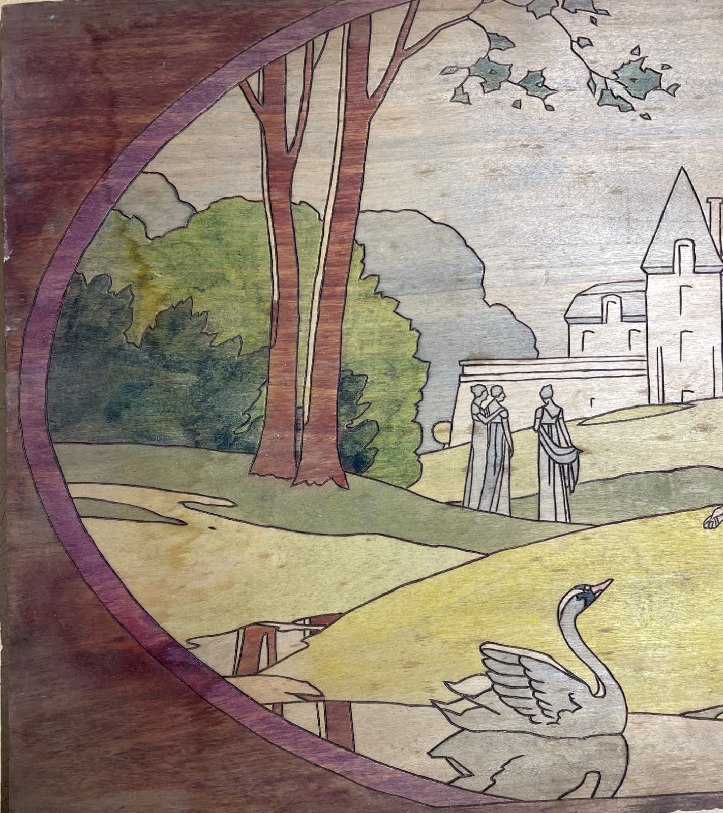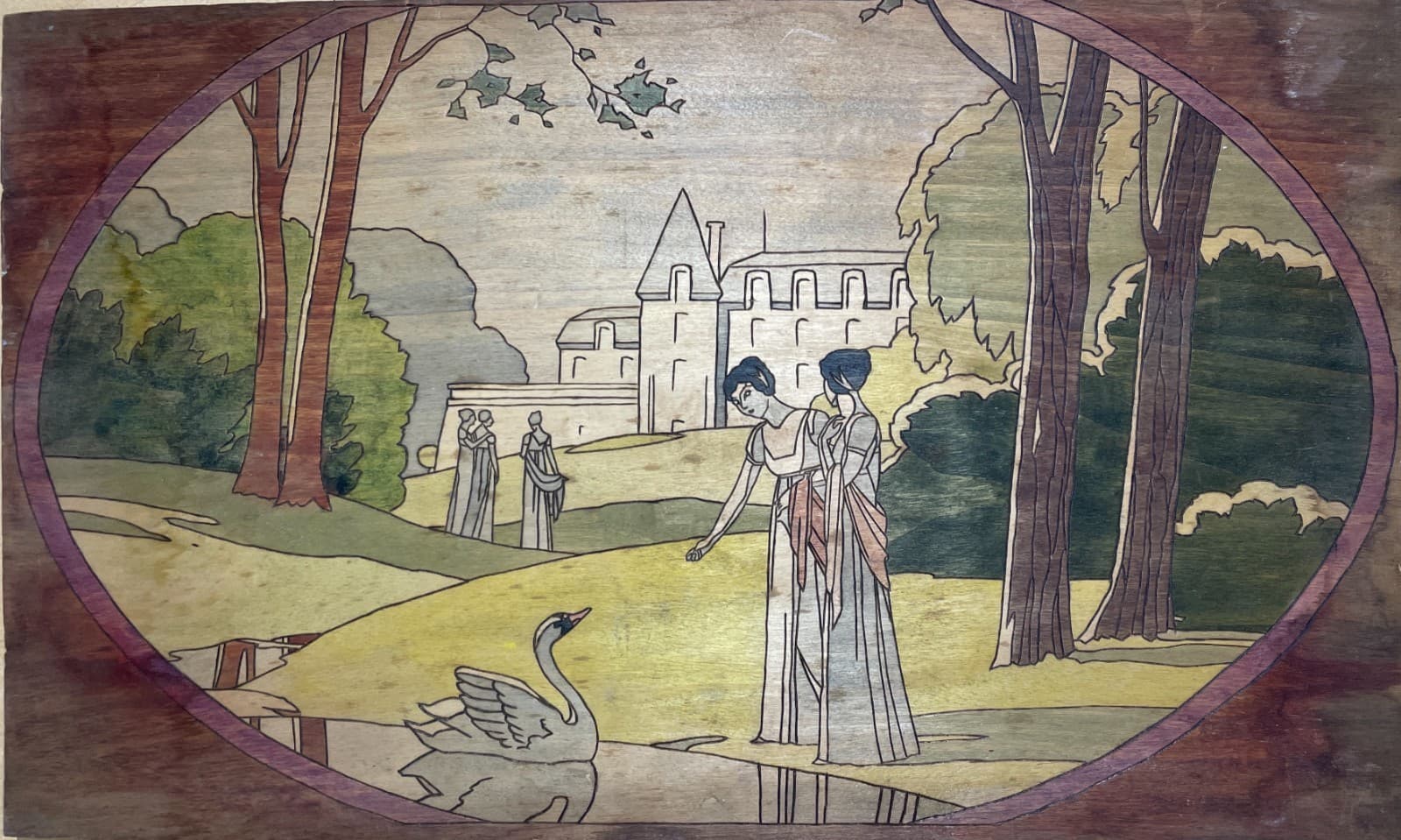 Illustrazione Artistica: Figure Femminili Con Cigno, Pannello Pirografato Stile Liberty