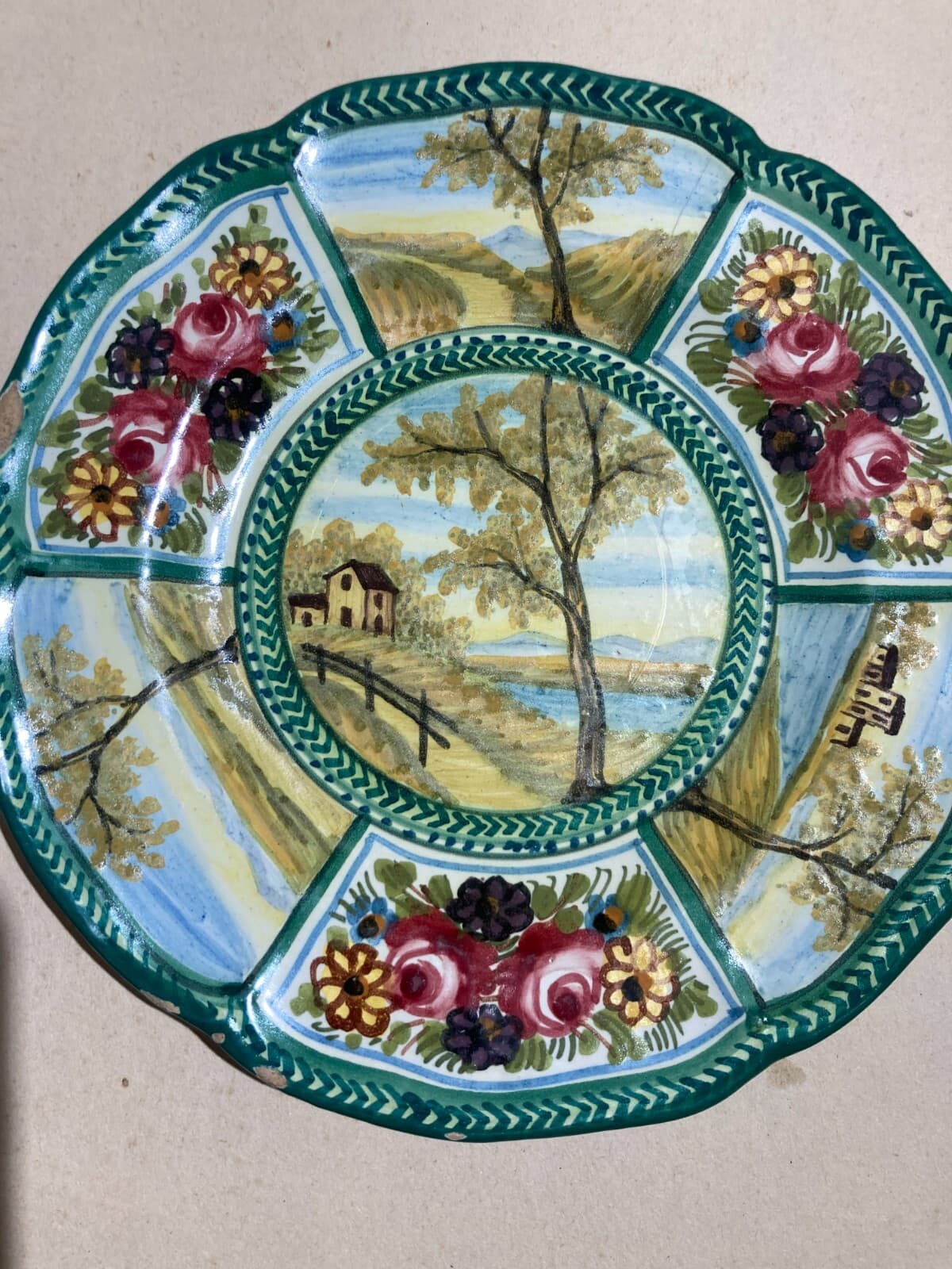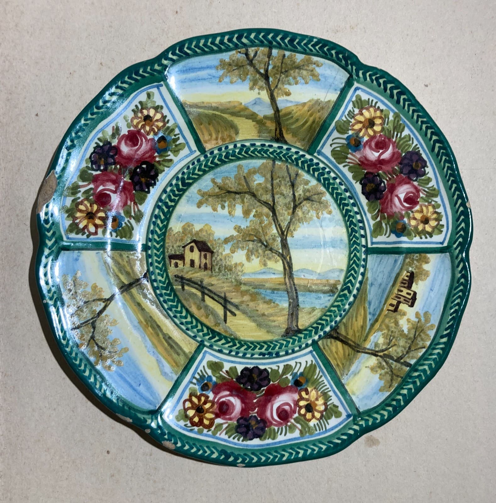 Decorativo Piatto In Ceramica, Paesaggi E Decori Floreali, Abruzzo, Bozzelli, '900