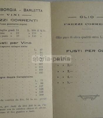 Enologia, Vino, Olio: Antico Listino, Puglia, Barletta, Borgia. Pieghevole d'Epoca, 1924