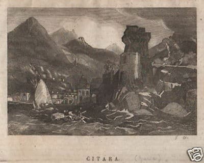 Antica Veduta Portuale Napoletana: Cetara, Torre Saracena, Incisione All'Acquaforte Del 1839
