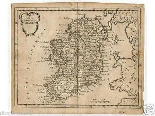 Mappa Antica Dell'Irlanda, Incisione Originale Di Vallet, Metà Del XVIII Secolo