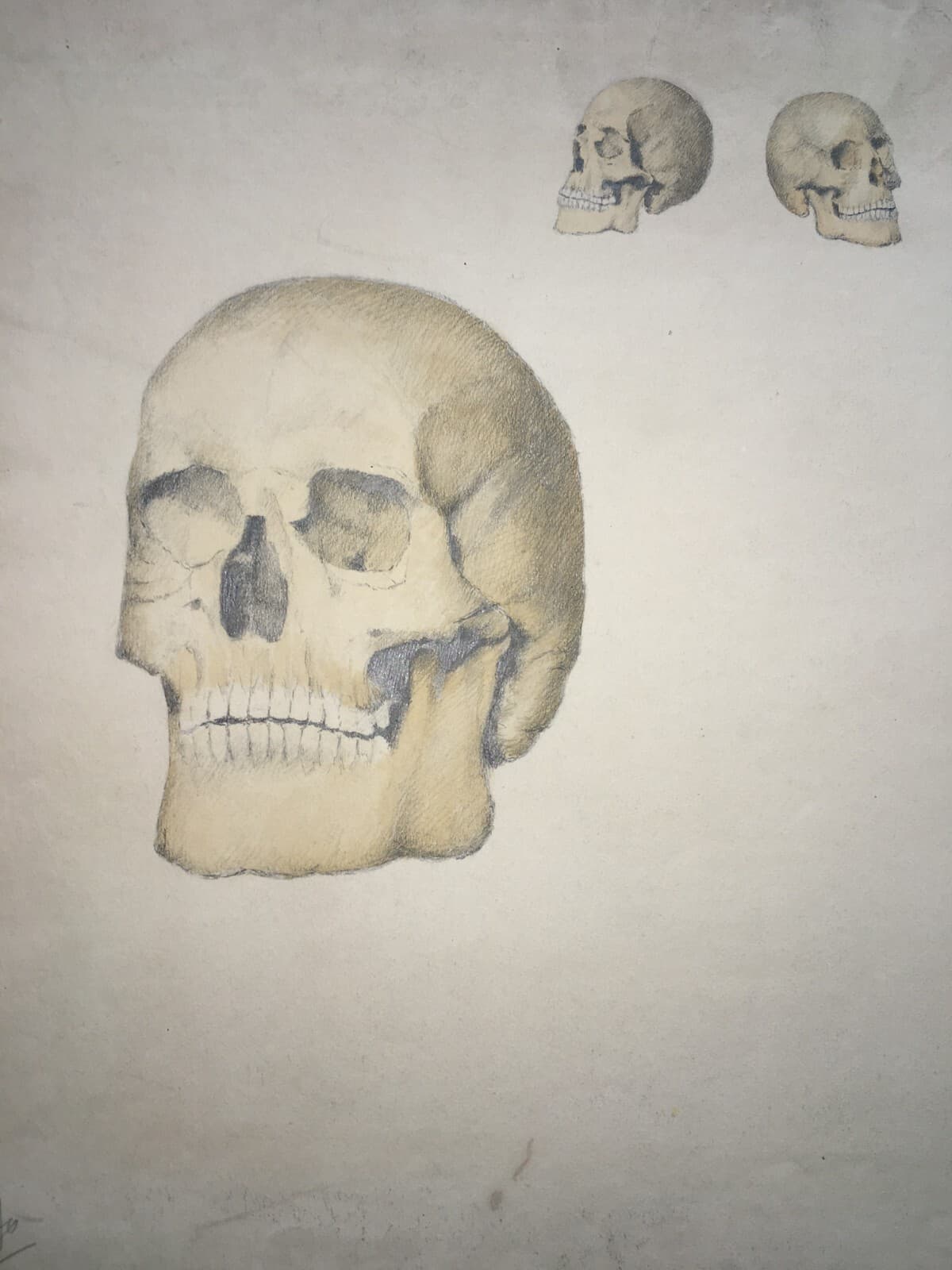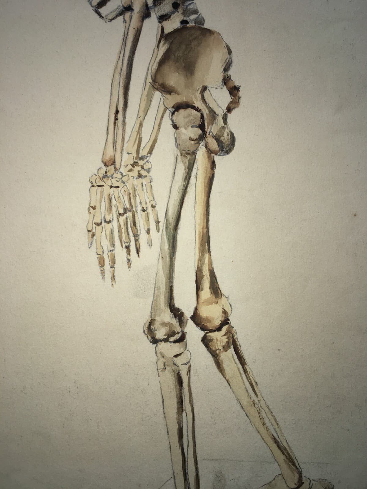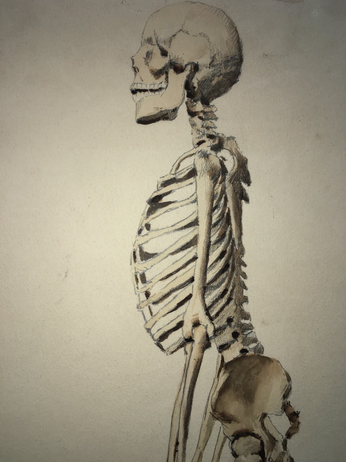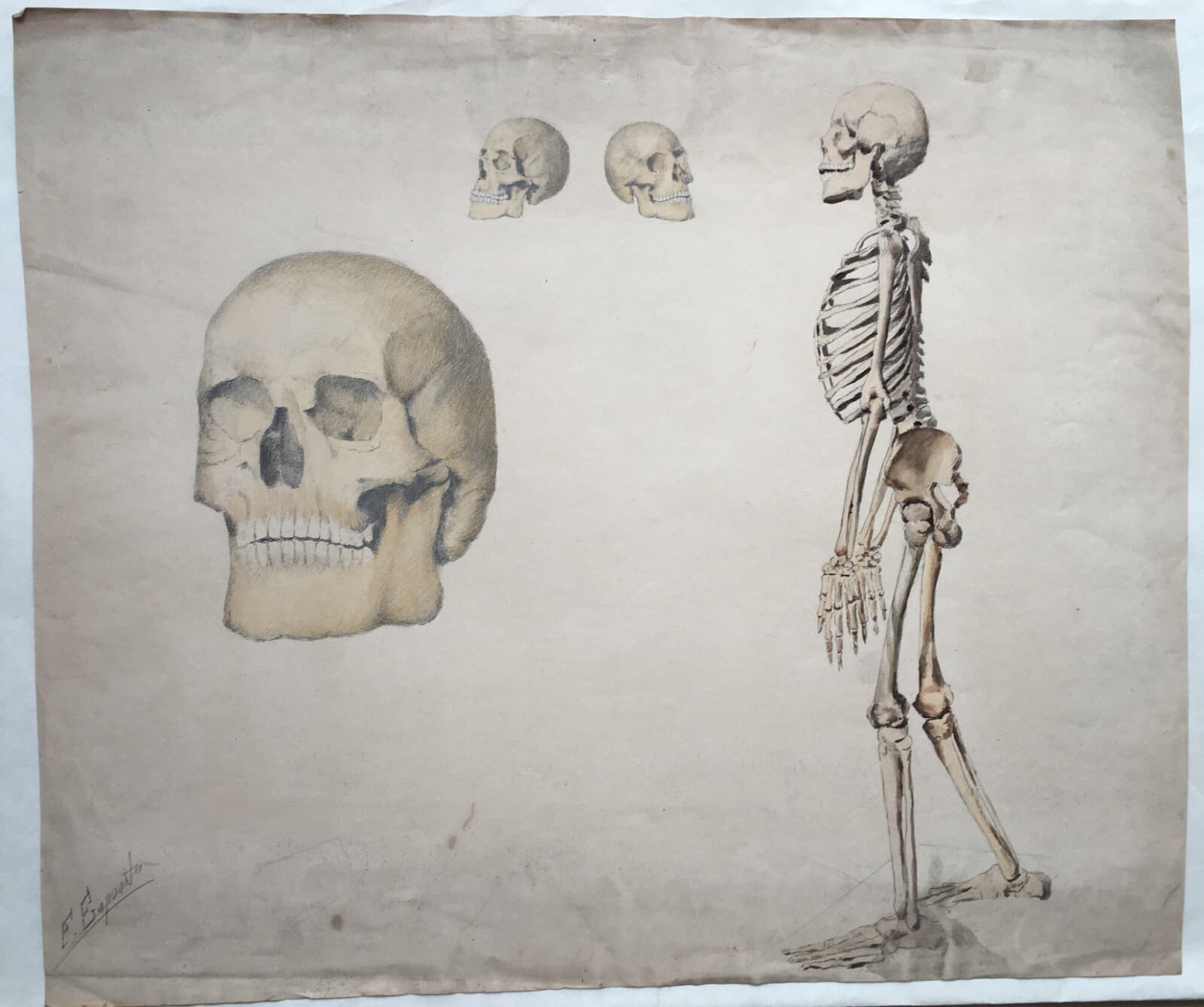 Scheletro E Teschio, Studio Anatomico. Disegno Acquarellato Di F. Esposito.
