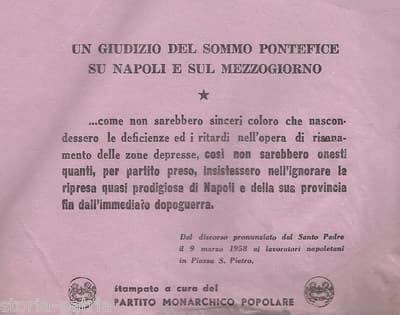 Napoli, Monarchia, Partito Monarchico Popolare, Chiesa, Papato, Discorso Del 1958
