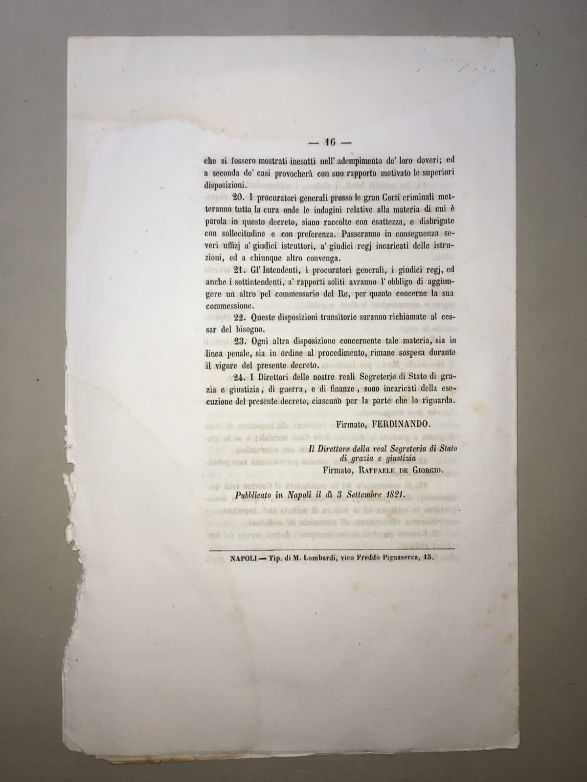 Giurisprudenza Campania, Napoli: Borboni, Regolamento Per La Trasmissione Dei Processi Originali (1847)