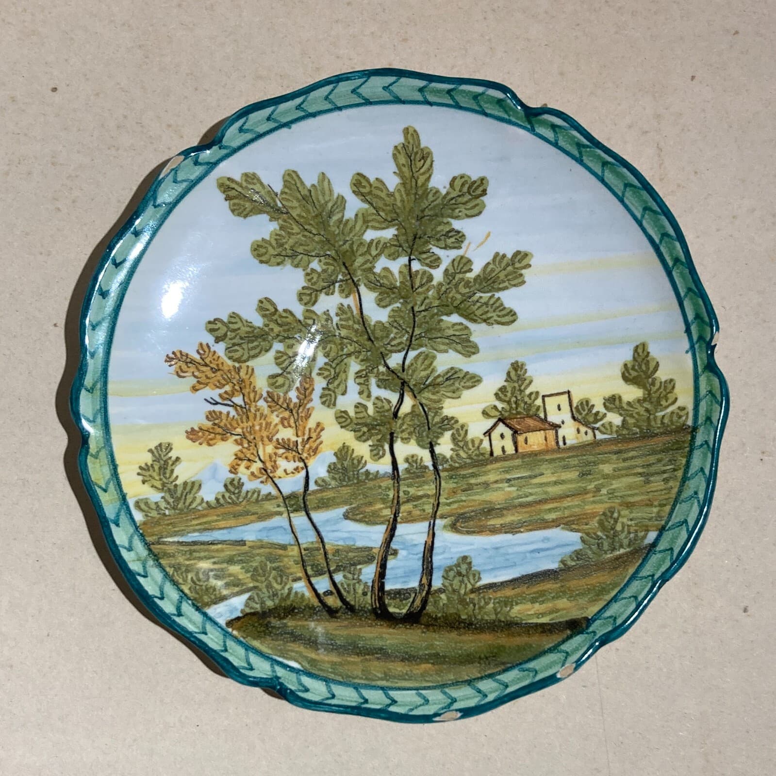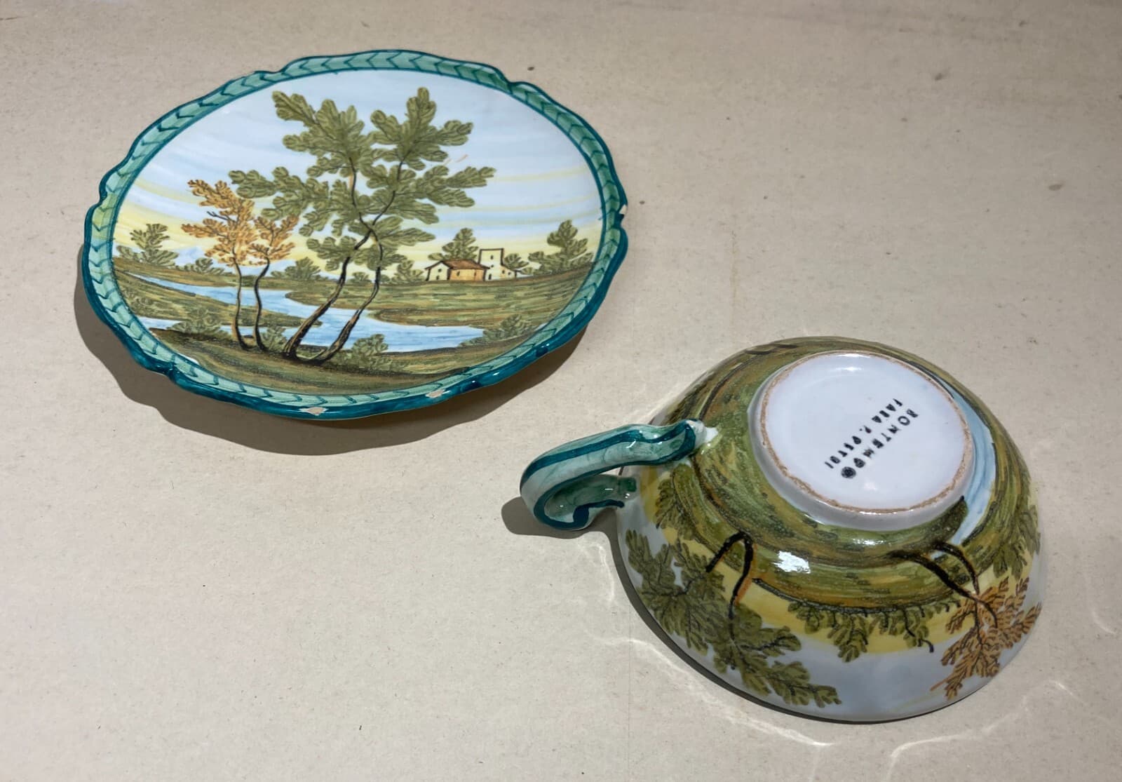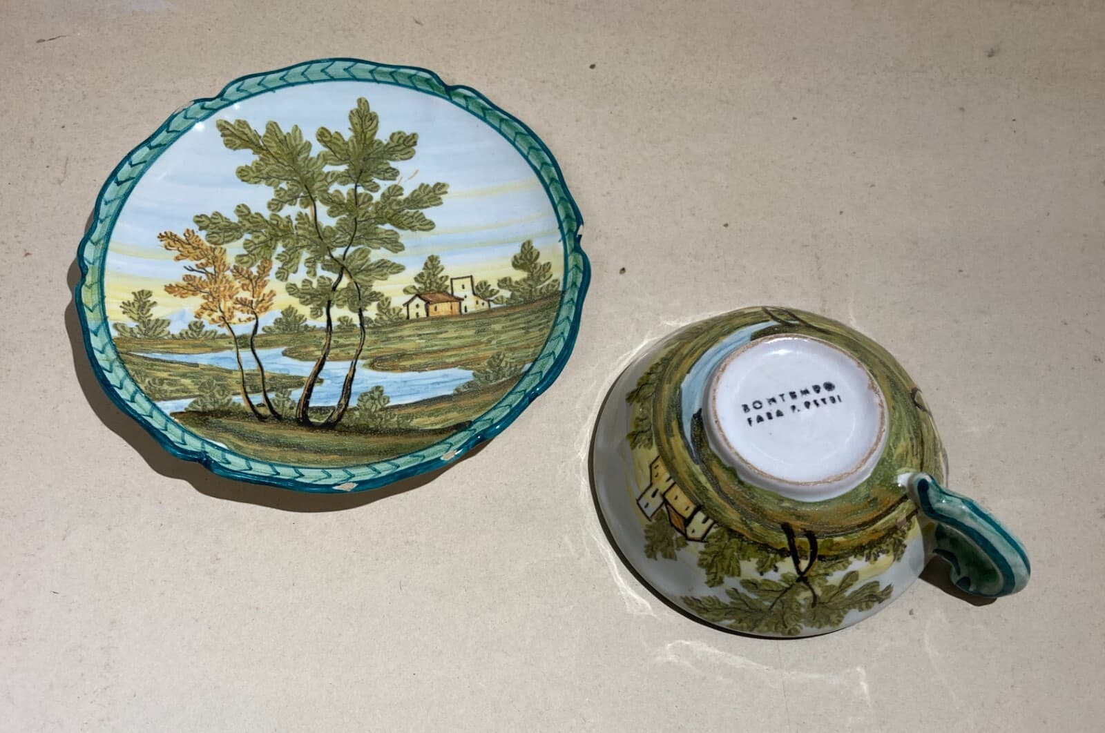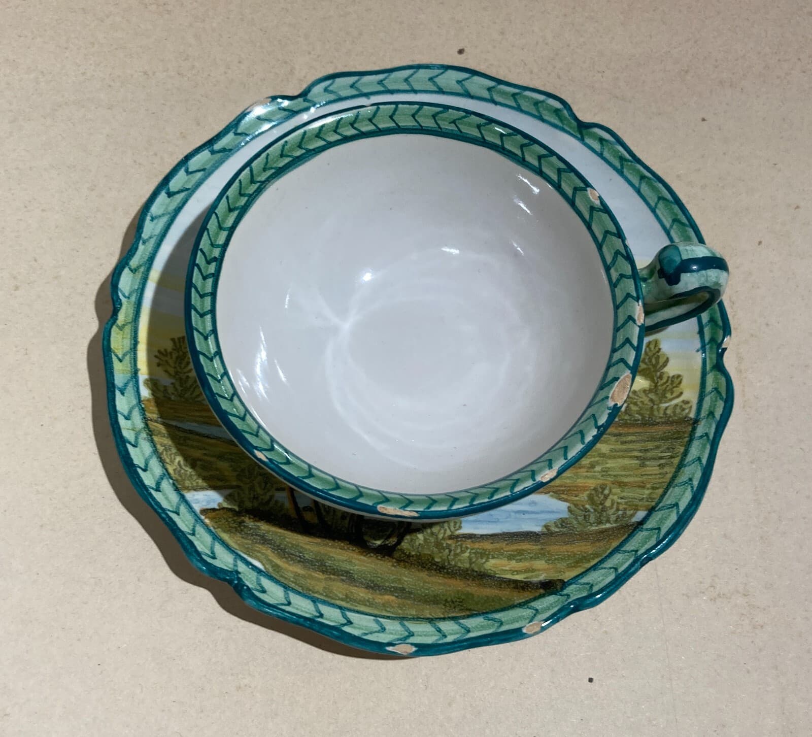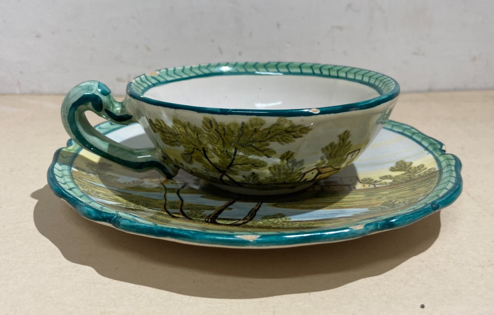 Abruzzo, Fara Filiorum Petri, Ceramiche Bontempo, Tazza Con Piattino Decorata A Mano, Paesaggi, 1930 1950
