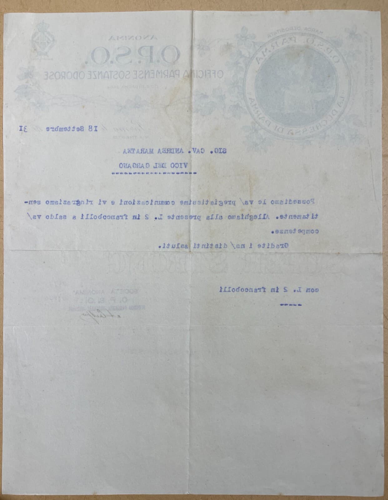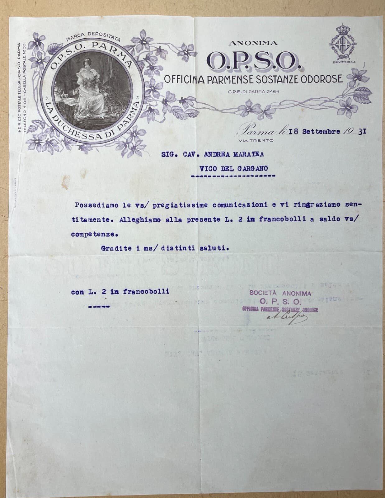 Parma Profumi Essenze Odorose O.P.S.O. Antica Pubblicitaria Carta Intestata Duchessa