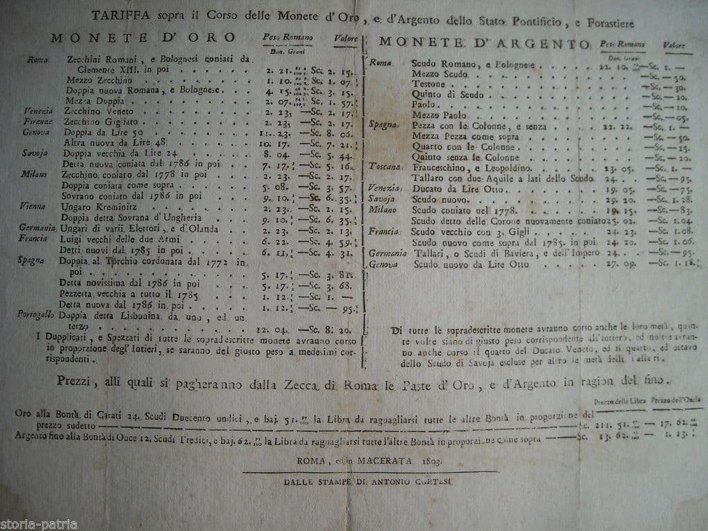 Tariffa Monete Oro Argento Stato Pontificio Roma Macerata 1803