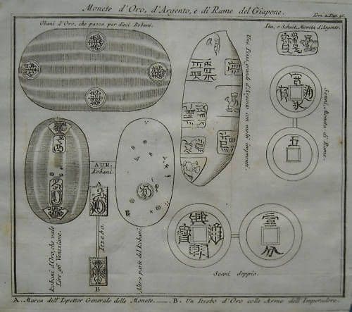 Incisione Antica Monete Giapponesi Obani Kobani Itzebo XVIII Secolo