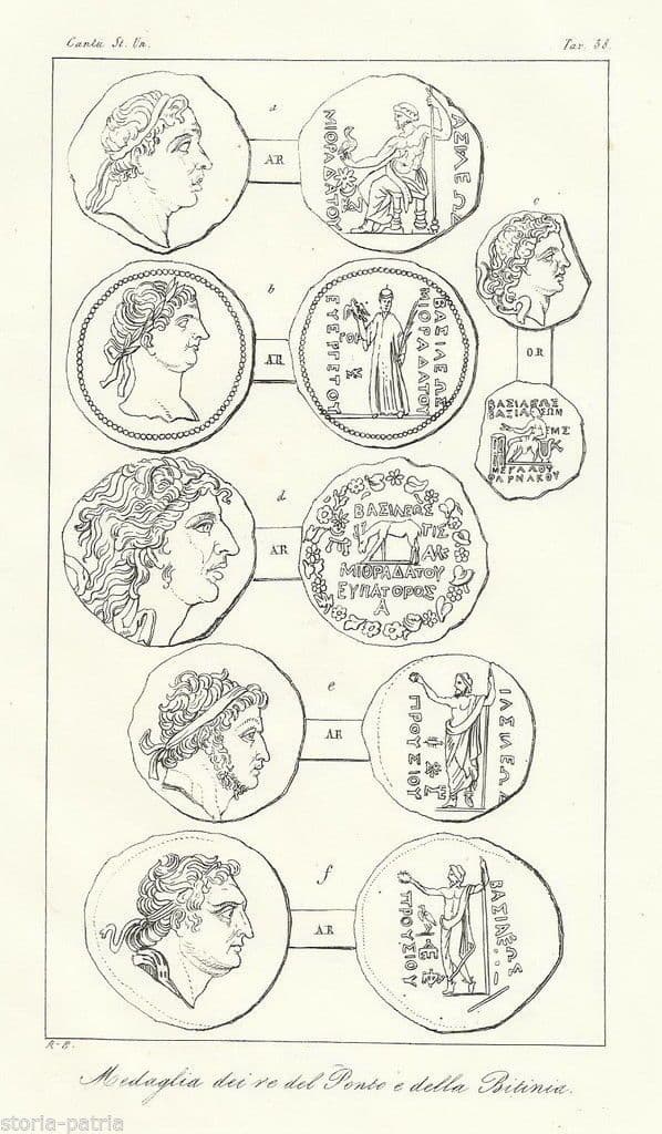 Incisione Antica Monete Del Ponto E Della Bitinia Medaglie Reali XIX Secolo