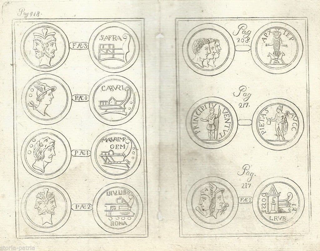 Incisione Antica: Monete Con Simbologie E Allegorie Mitologiche