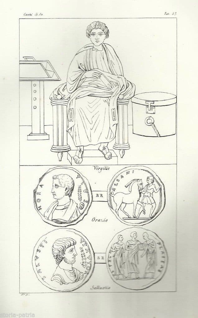 Incisione Antica Con Virgilio, Orazio E Sallustio: Monete E Medaglie