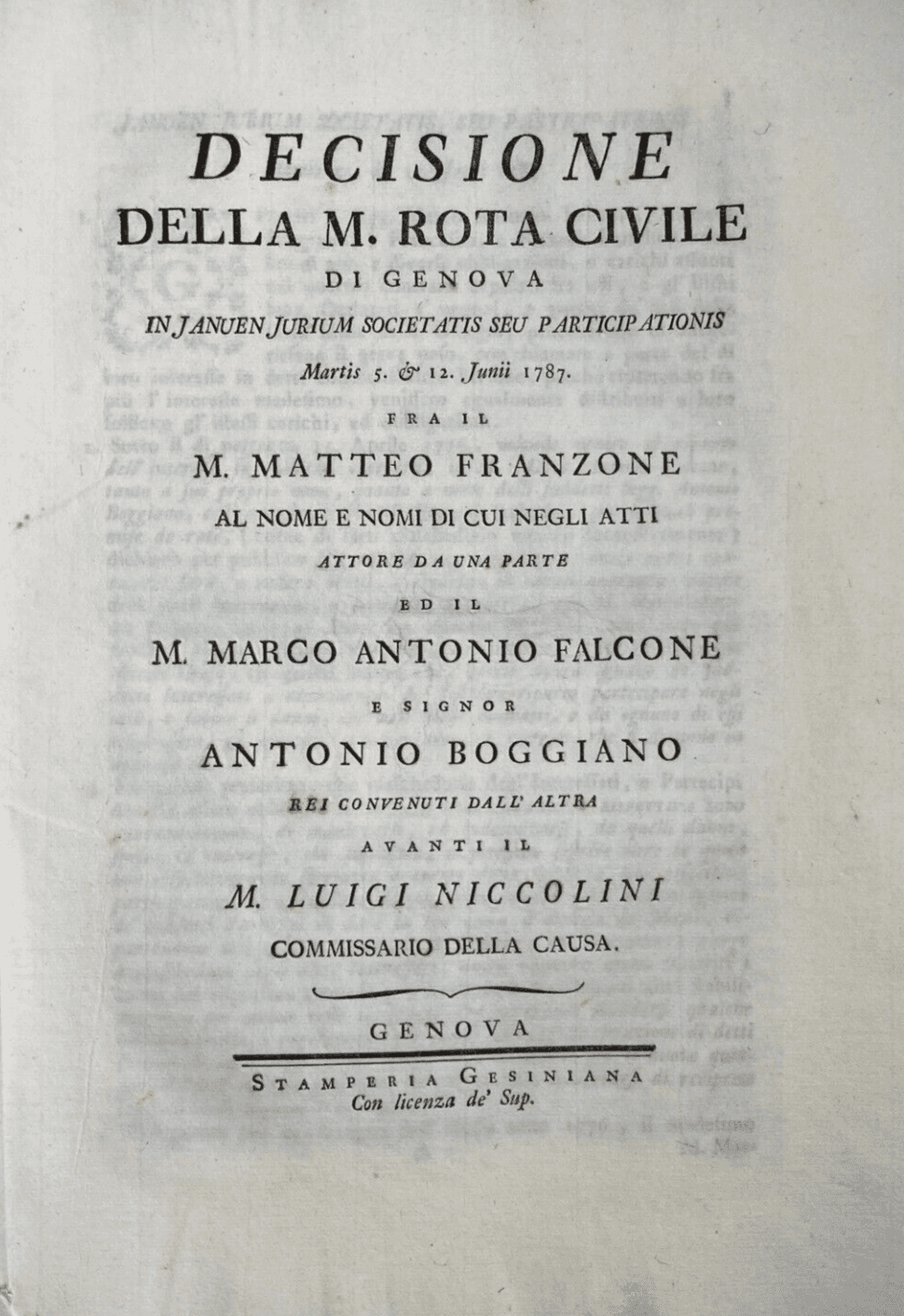 Liguria, Genova: Antica Allegazione Giuridica Franzone, Falcone, Boggiano, Ilarj (1787)