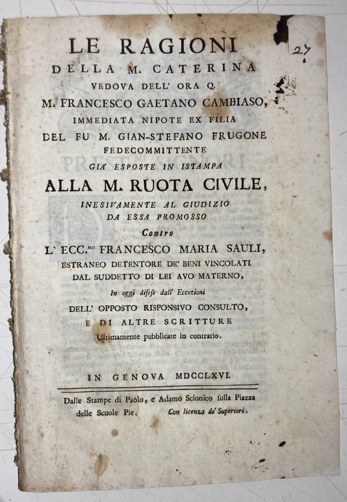 Liguria, Genova: Antica Allegazione Giuridica Su Eredità Cambiaso, Frugone, Sauli