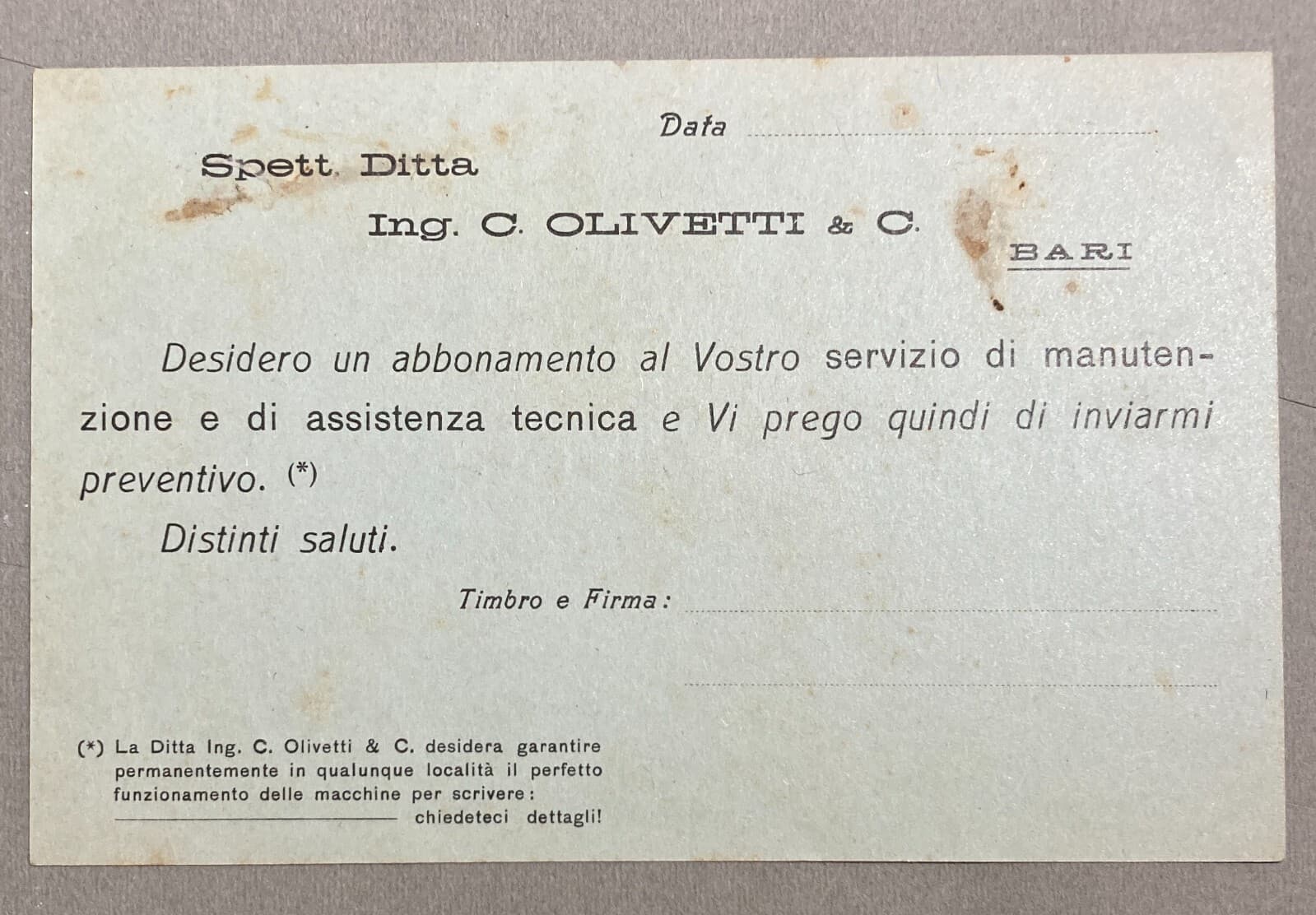 Puglia, Bari: Cartolina Pubblicitaria Olivetti. Manutenzione. Giglio Tos (Ivrea)