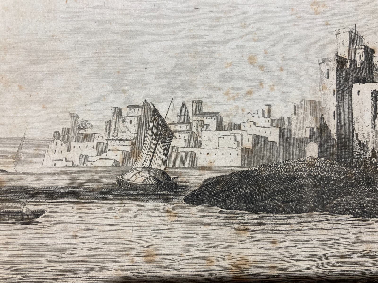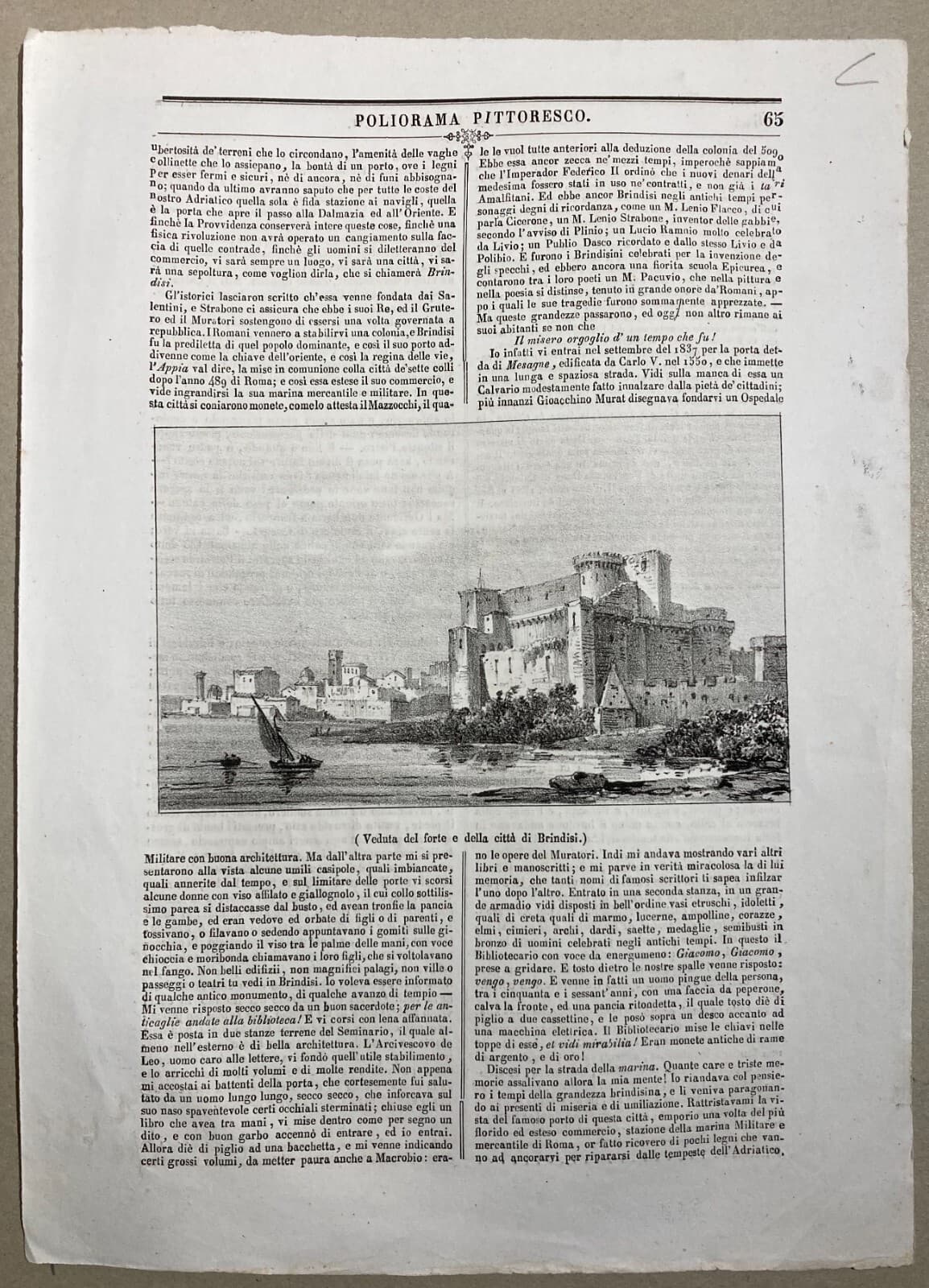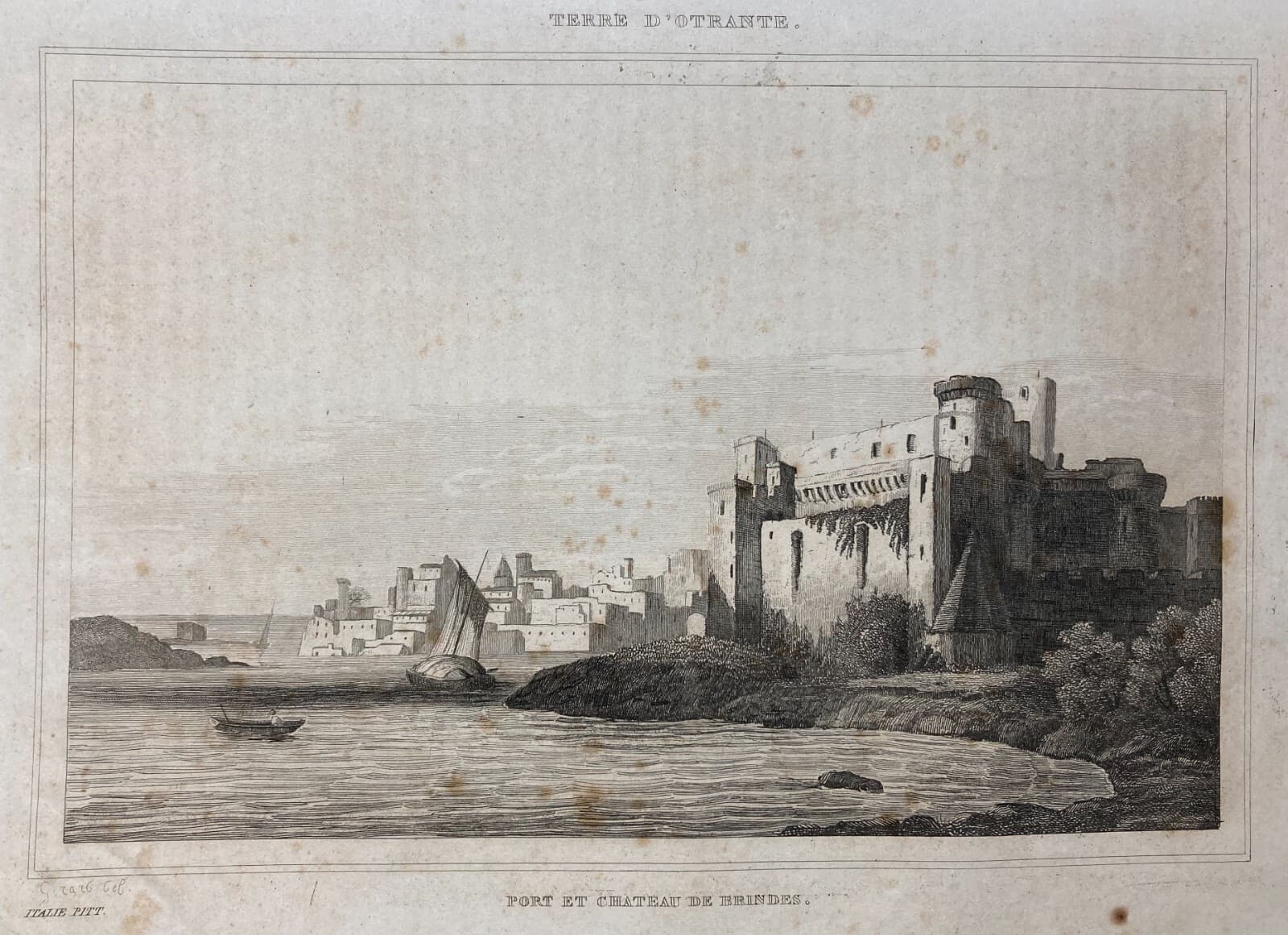 Puglia, Salento, Brindisi. Antica Veduta Litografica: Castello, Barche, Panoramica