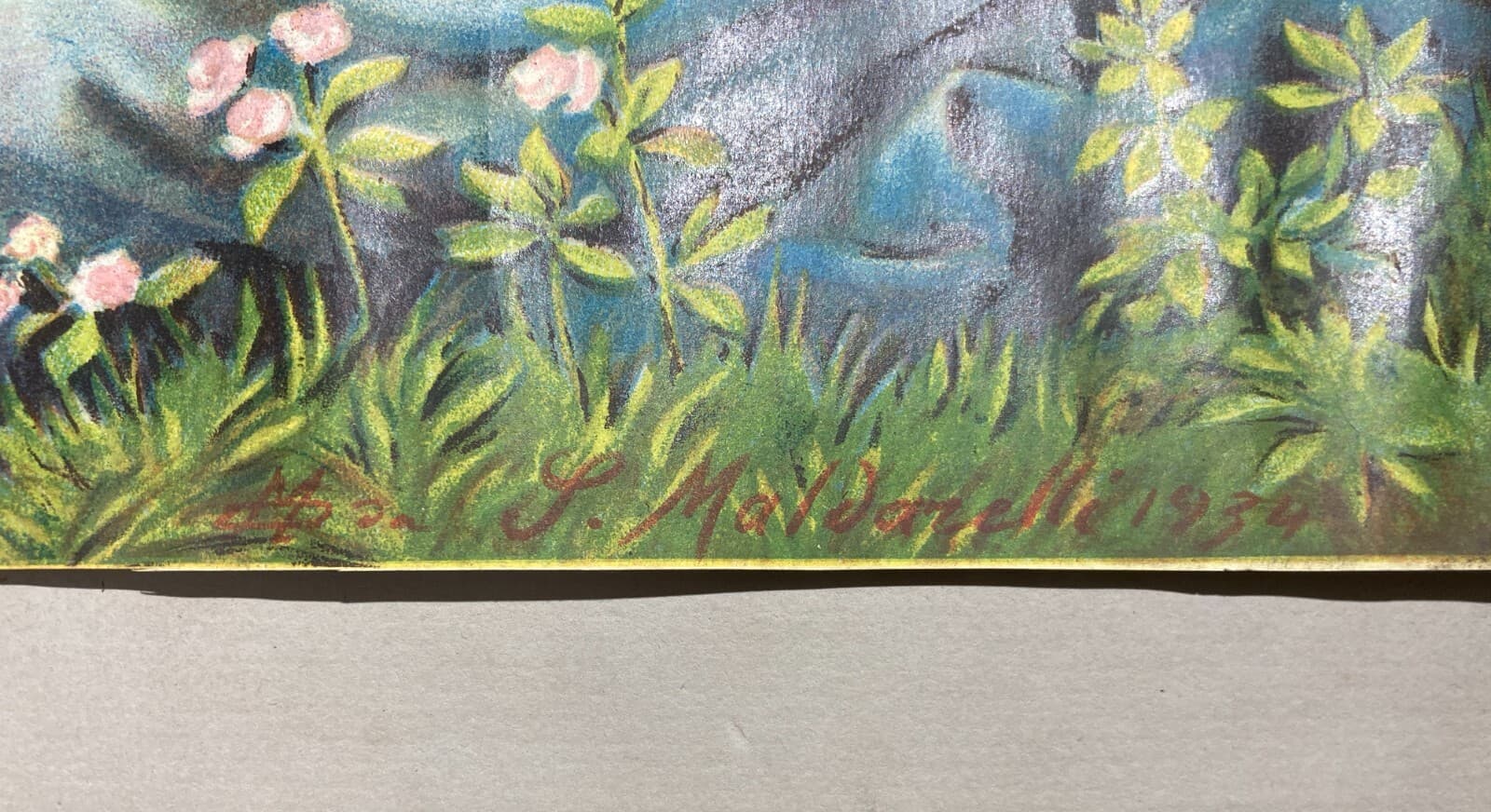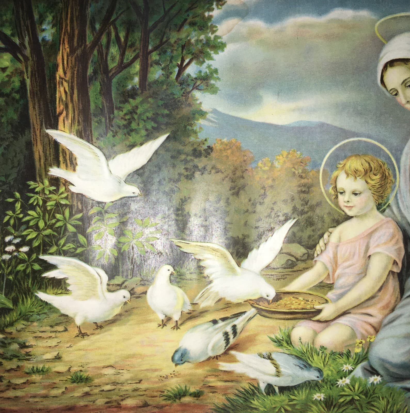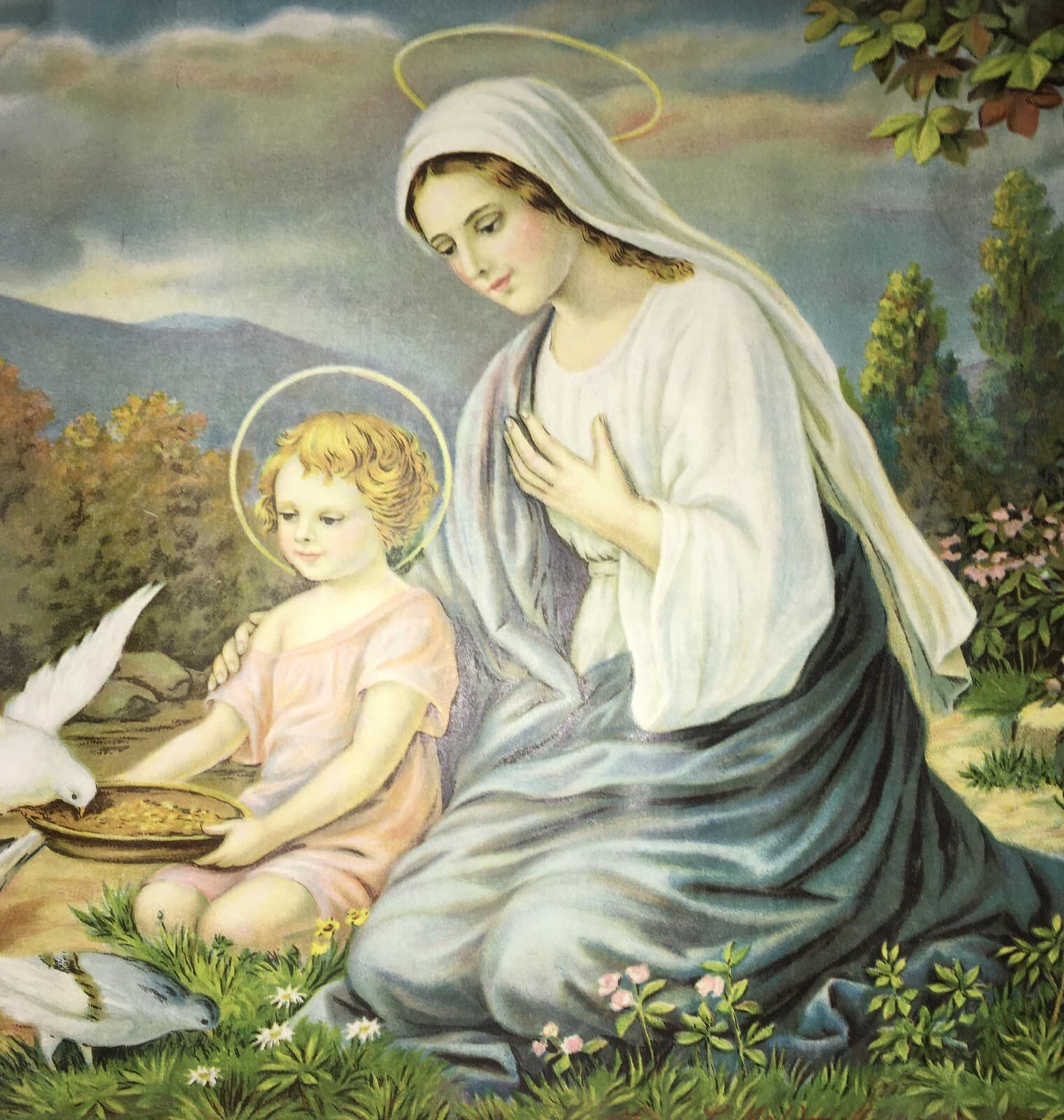 Madonna Con Bambino: Paesaggio Con Colombe. Cromolitografia d'Epoca Di Maldarelli, 1934