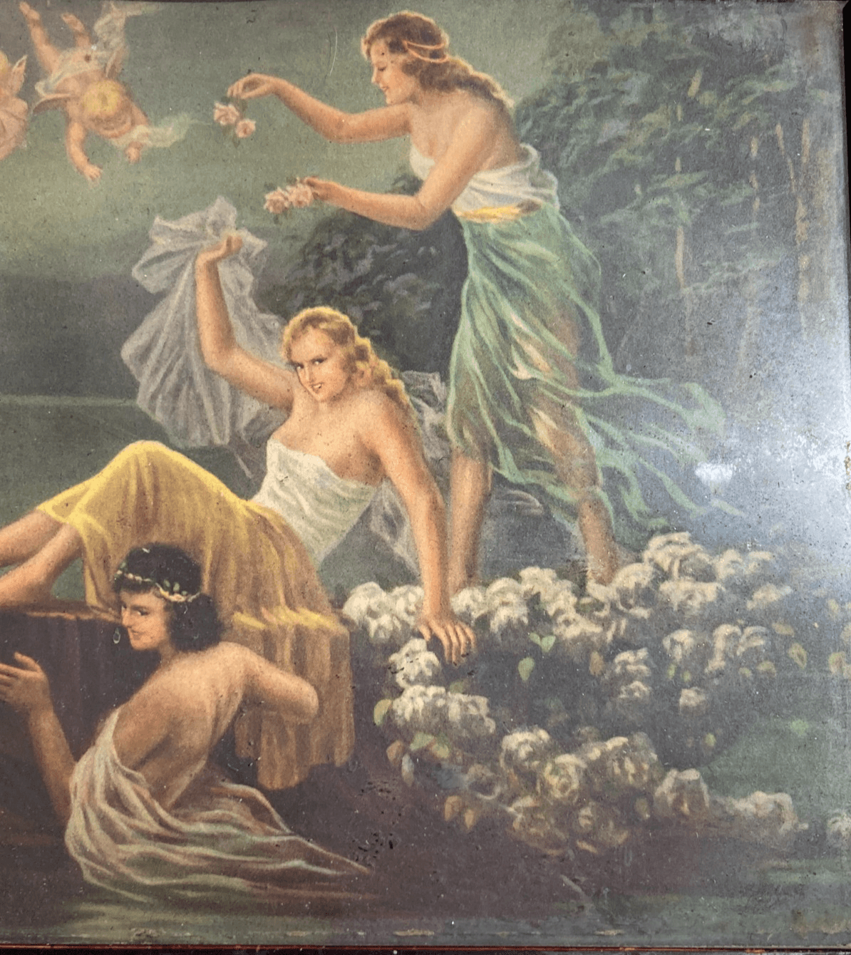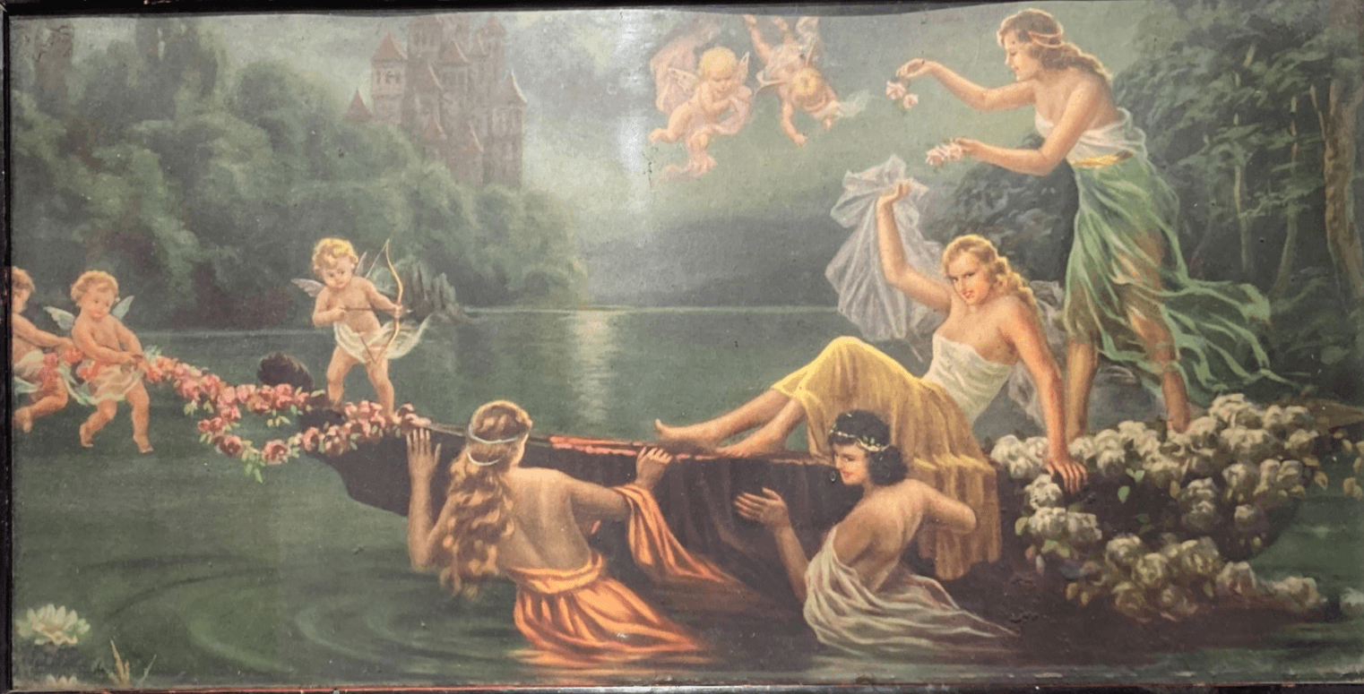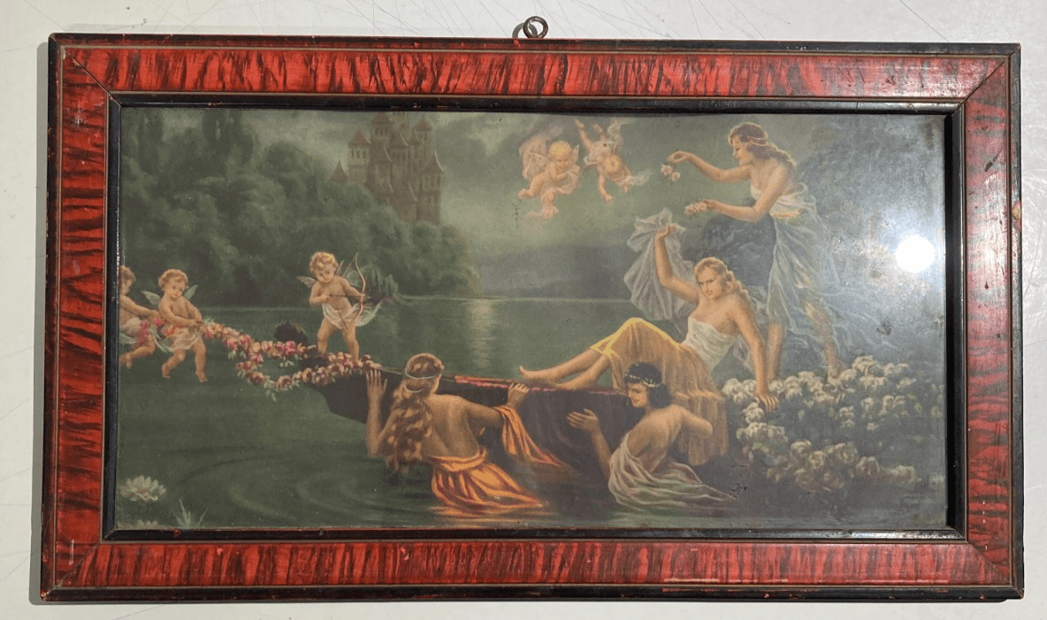 Scena Mitologica Con Ninfe E Puttini Lago Con Castello Stampa Oleografica