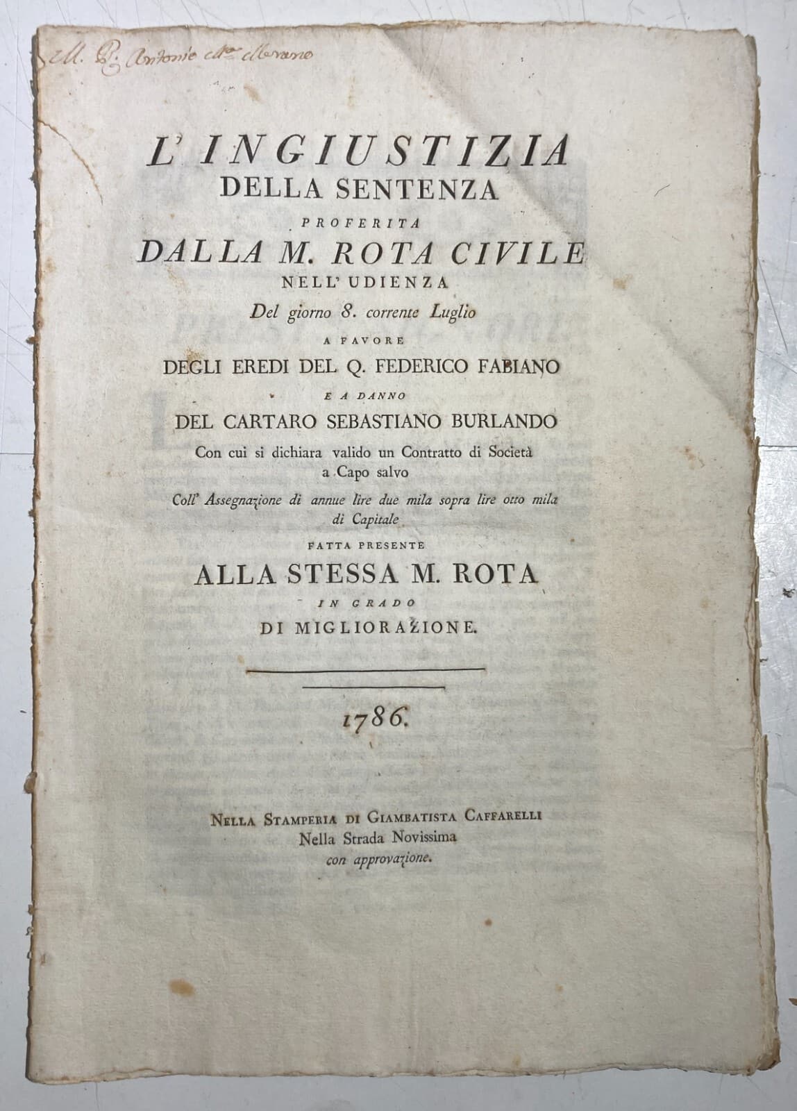 Decisione Della M. Rota Civile Di Genova (1786) Vertenza Grimaldi, Pallavicino, Parisetti