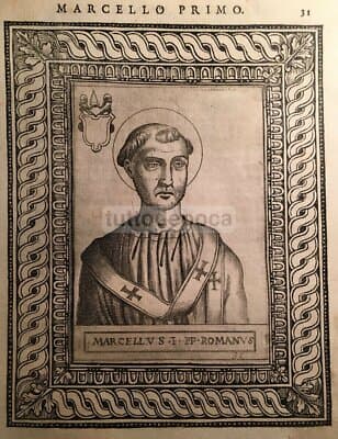 Storia Del Papato: Ritratto Del Pontefice Marcello I. Incisione Del XVI Secolo Con Araldica.