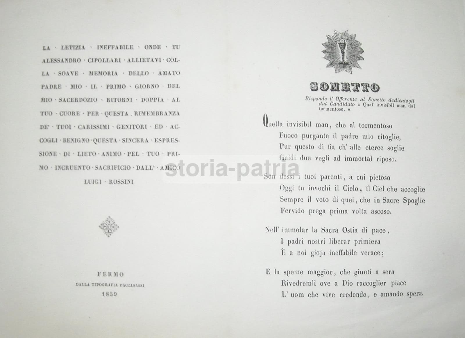 Sonetto Di Luigi Rossini Per Il Sacerdozio Di Alessandro Cipollari, Fermo 1859
