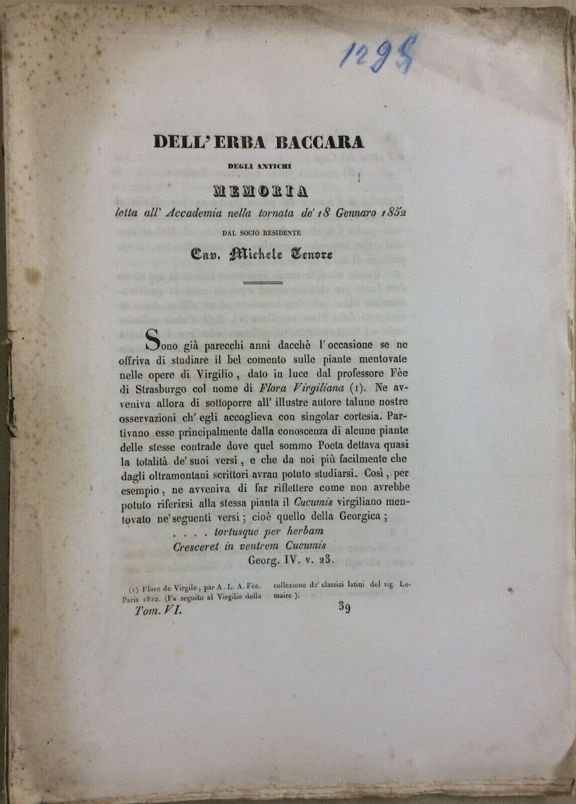 Botanica: Erba Baccara. Tenore, Gussone, Gasparrini. Flora Virgiliana, 1852