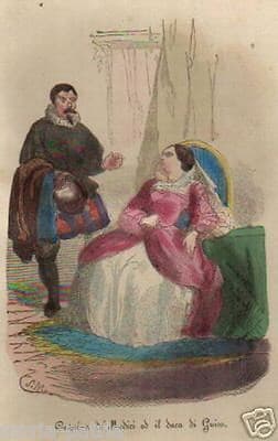 Caterina De' Medici E Il Duca Di Guisa Stampa Antica A Colori Inquisizione 1860 Circa