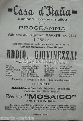 Musica, Teatro, Filodrammatica: Casa d'Italia, Camasio, Oxilia, Mascagni, Rocha, Torino