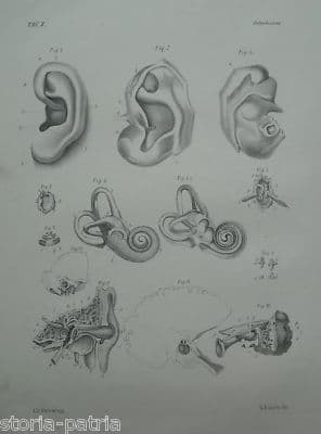 Medicina: Organo Dell'Udito, Orecchio, Otorino. Antica Litografia Napoletana Del XIX Secolo